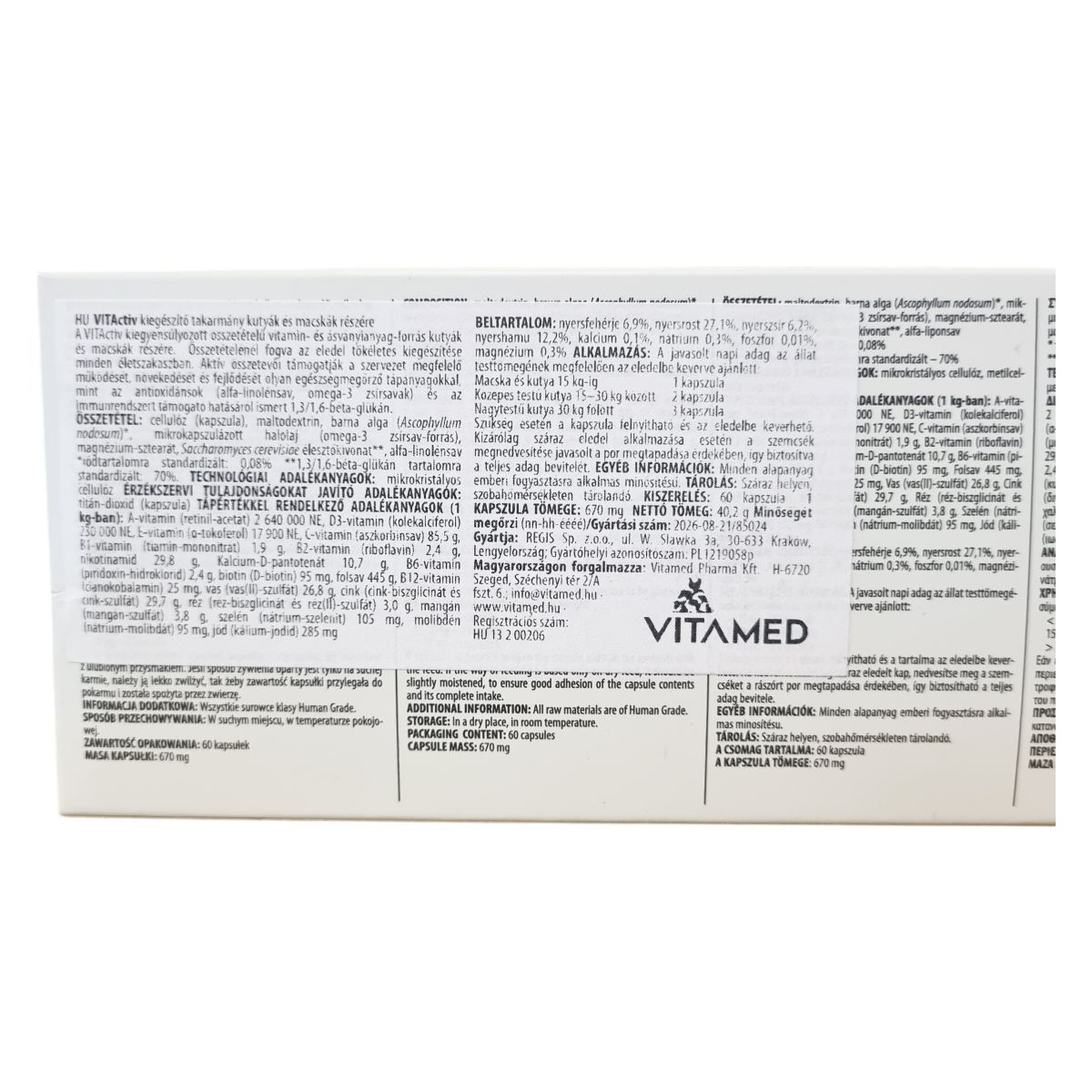 A VITActiv egy kiegyensúlyozott vitamin- és ásványianyag-komplex kutyák, macskák és húsevő kisállatok részére, amely kiegészíti az állatok étrendjét minden életszakaszban. Aktív összetevői antioxidánsokat (alfa-linolénsav, omega-3 zsírsavak) és az immunrendszer működését támogató 1,3/1,6-beta-glükánt tartalmaznak. Az alapanyagok emberi fogyasztásra alkalmas minőségűek, és a kapszula könnyen adagolható, szükség esetén felnyitható, eledelbe keverhető formában kerül forgalomba. A készítmény a megfelelő működést, növekedést és fejlődést támogathatja, miközben pótolja a szervezet számára nélkülözhetetlen vitaminokat és ásványi anyagokat. A termék gyártója a REGIS Sp. z o.o. Lengyelországban, forgalmazója pedig a Vitamed Pharma Kft. Magyarországon.