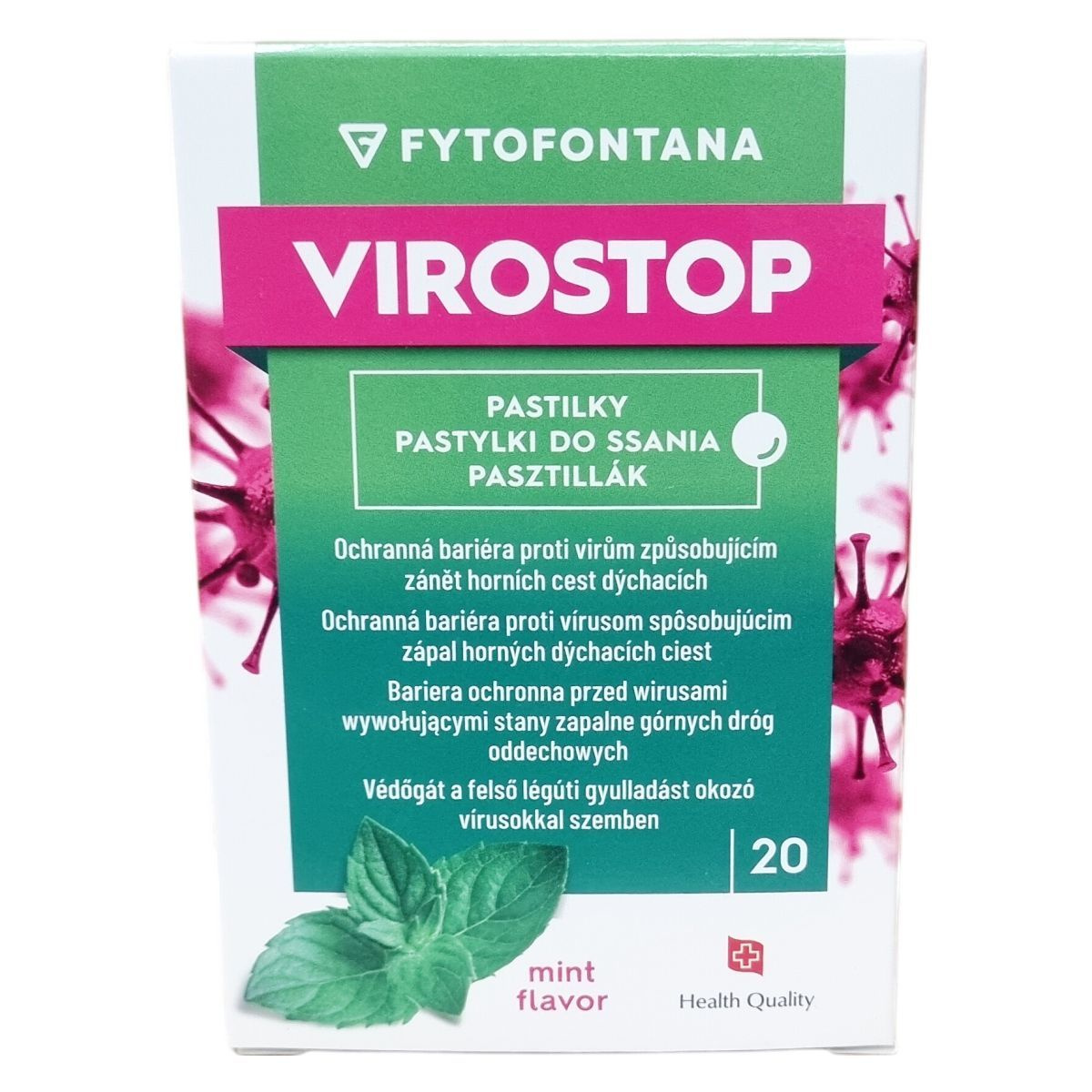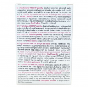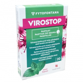 A Fytofontana VIROSTOP pasztillák alkalmazása a felső légutak nyálkahártyáján történik, és védőgátként szolgálhatnak a vírusok okozta gyulladások ellen. A termék természetes alapanyagokból készül, melyek között megtalálható a mediterrán bodorrózsa, bíbor kasvirág, orvosi zsálya, citrus bioflavonoid komplex és acerola kivonat. A csomagolás 20 pasztillát tartalmaz bliszterben. A termék ízesített, mentás aroma segítheti a kellemes használatot. Különösen felnőttek és 12 éven felüli gyermekek számára ajánlott. A pasztillákat kisgyermekektől elzárva kell tárolni, és a felhasználás előtt ajánlott elolvasni a használati útmutatót. A tárolási hőmérséklet 10 és 25 °C között optimális. A termék vegán és bio is lehet, mely külön jelölve van a csomagoláson.