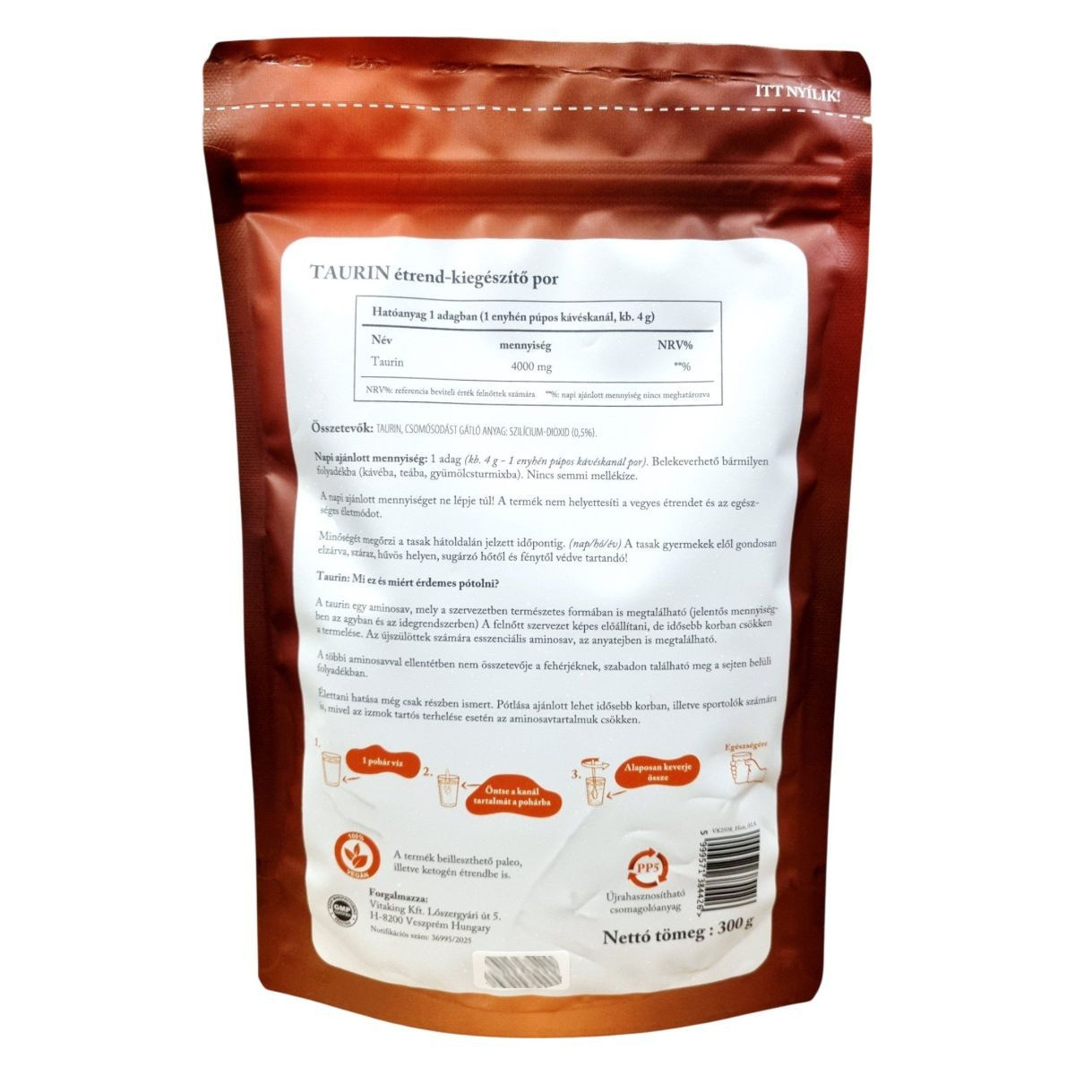Taurin, csomósodást gátló anyag: szilícium-dioxid (0,5%).