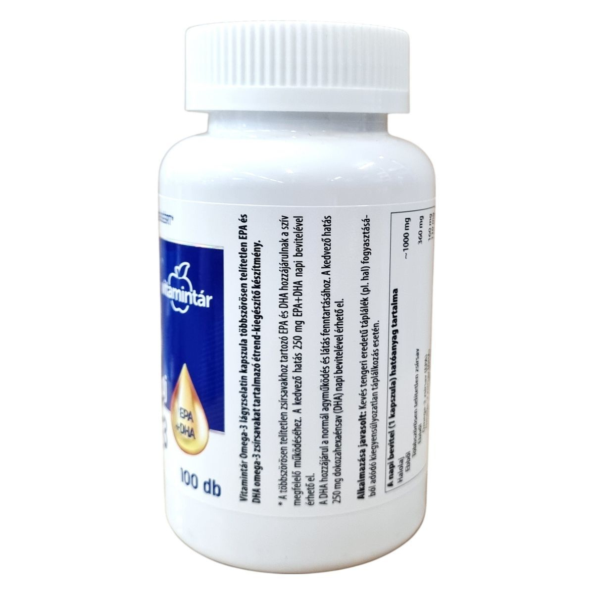 A Vitamintár Omega-3 lágyzselatin kapszula többszörösen telítetlen EPA és DHA omega-3 zsírsavakat tartalmazó étrend-kiegészítő, amely elsősorban a kevés tengeri eredetű táplálék fogyasztásából eredő kiegyensúlyozatlan táplálkozás esetén ajánlott. Az EPA és DHA hozzájárulhatnak a szív megfelelő működéséhez, a kedvező hatás napi 250 mg EPA+DHA bevitelével érhető el. A kapszula 100 db-os kiszerelésben kapható, 1,35 g-os lágyzselatin kapszulákat tartalmaz.