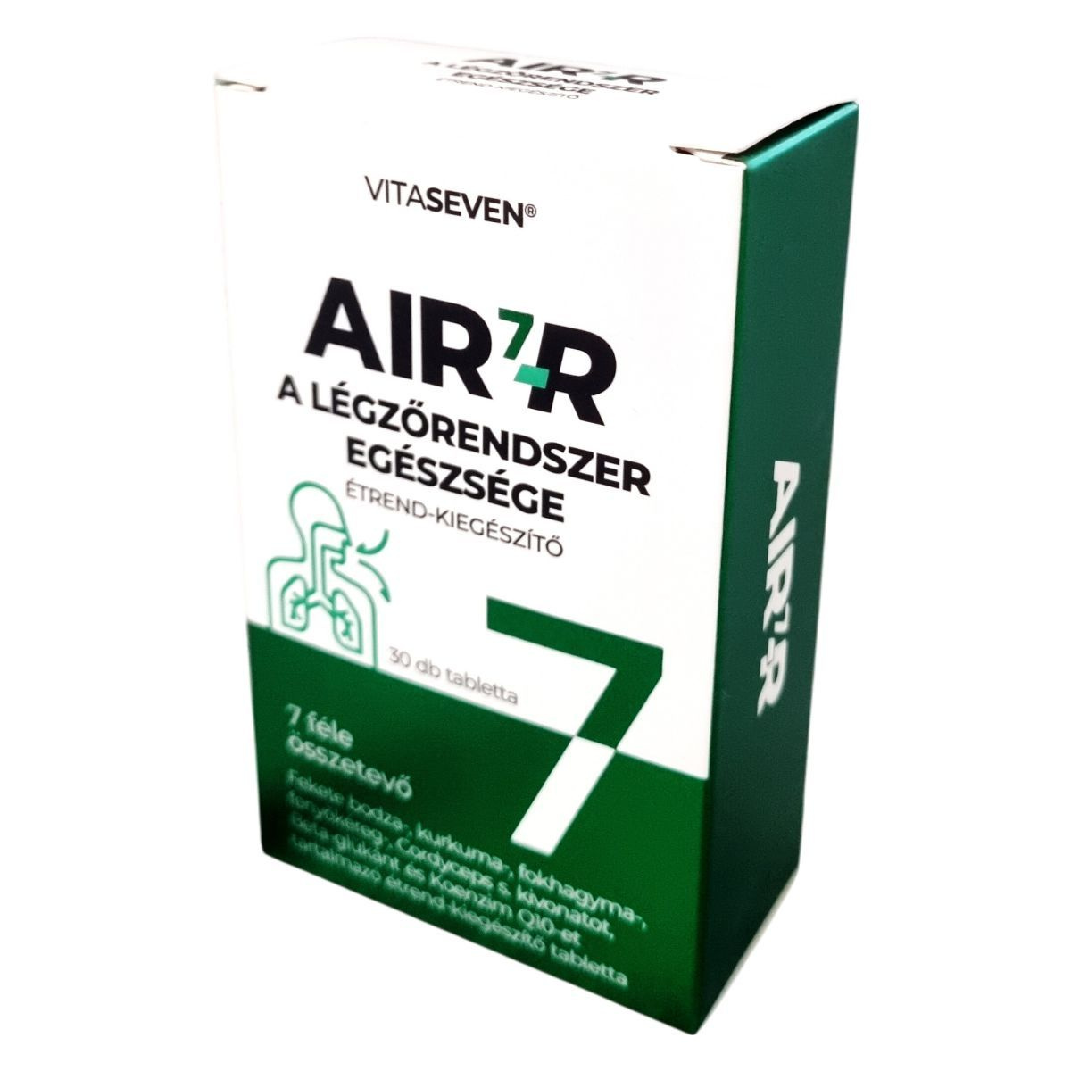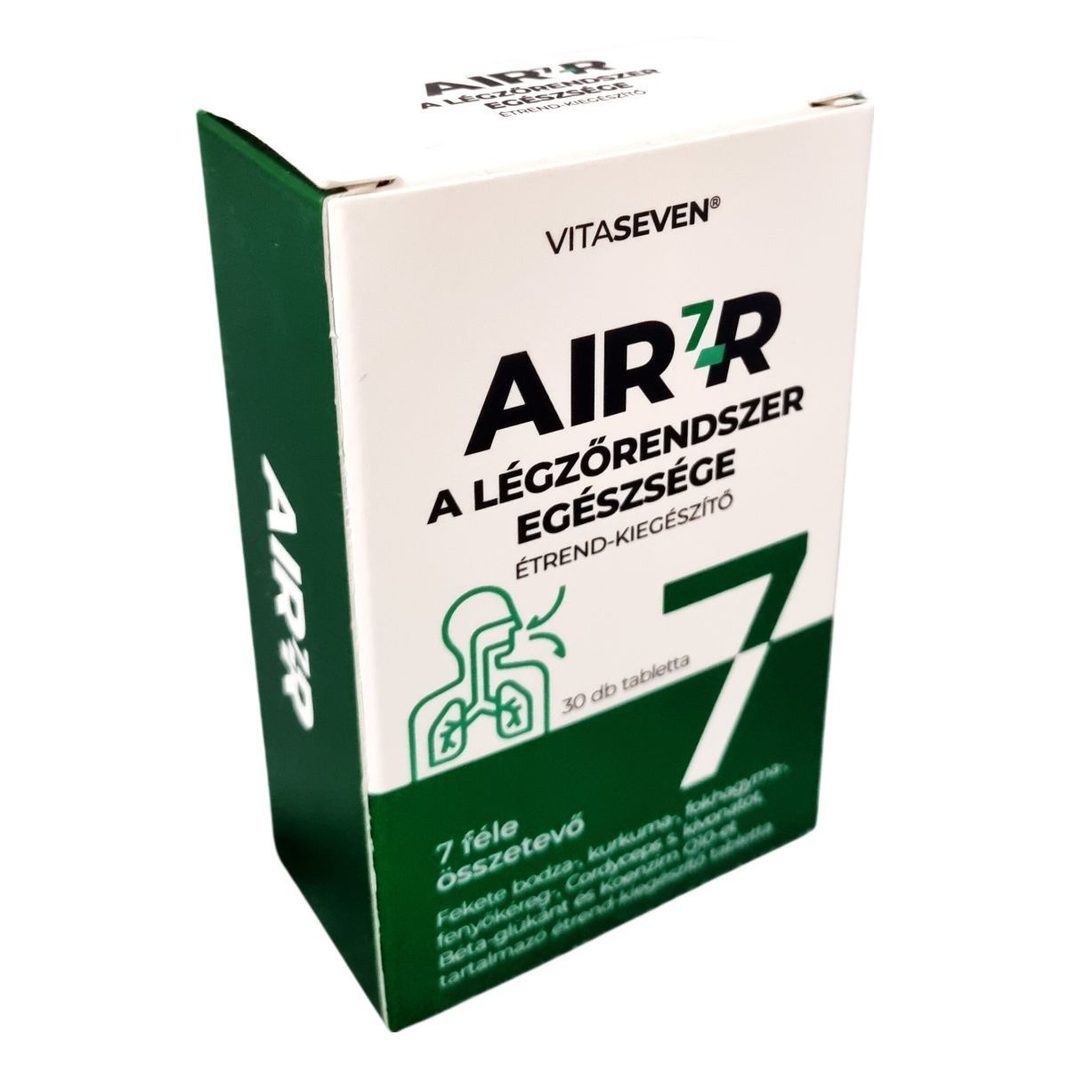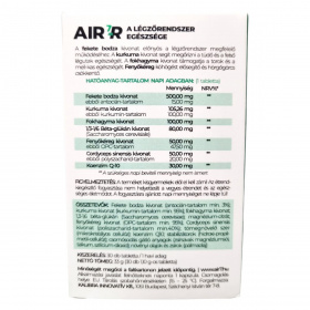 A Vitaseven Air7R egy komplex étrend-kiegészítő, amely növényi kivonatokat és koenzim Q10-et tartalmaz a légzőrendszer megfelelő működésének támogatásához. A fekete bodza és a fenyőkéreg kivonat antioxidáns tulajdonságukkal segíthetnek a sejtek védelmében, míg a kurkuma és a fokhagyma hozzájárulhatnak a légutak tisztaságához. A Cordyceps sinensis és a béta-glükán a szervezet természetes védekezőképességét támogathatják. A formula vegán, természetes összetevőkre épül, és nem tartalmaz mesterséges adalékanyagokat. Napi egy tabletta fogyasztása kíméletesen segítheti a tüdő és a torok egészségének fenntartását.