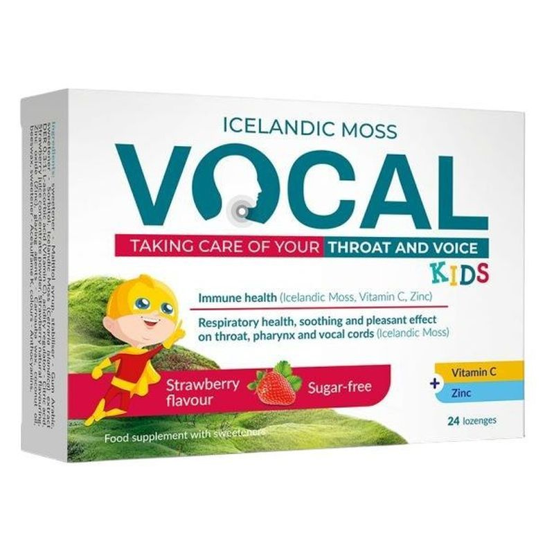 Izlandi zuzmó (Cetraria islandica) enyhíti a torok és a garat irritációját. Nyugtató és kellemes hatással van a torokra, garatra és a hangszálakra. Védi a száj és a torok nyálkahártyáját. A Vocal izlandi zuzmót, C-vitamin és cink elegyet tartalmaz. A C-vitamin és a cink hozzájárul az immunrendszer megfelelő működéséhez és védi a sejteket az oxidatív stressztől. A cink szerepet játszik a sejtosztódás folyamatában.