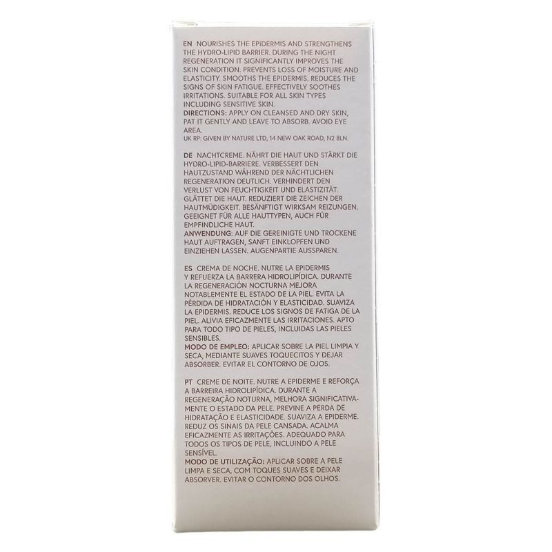 99%-ban természetes eredetű összetevők felhasználásával készült éjszakai tápláló, regeneráló arckrém. Táplálja az epidermiszt, erősíti a hidro-lipid gátat és jelentősen javítja a bőr állapotát. Hialuronsav tartalma megakadályozza a nedvességvesztést és biztosítja a bőr rugalmasságának megőrzését. Kisimítja a felhámot és csökkenti a bőr fáradtságának jeleit. Irritáció enyhítő hatása miatt még az érzékeny bőr ápolására is alkalmas. Kellemes natúr illatú.
