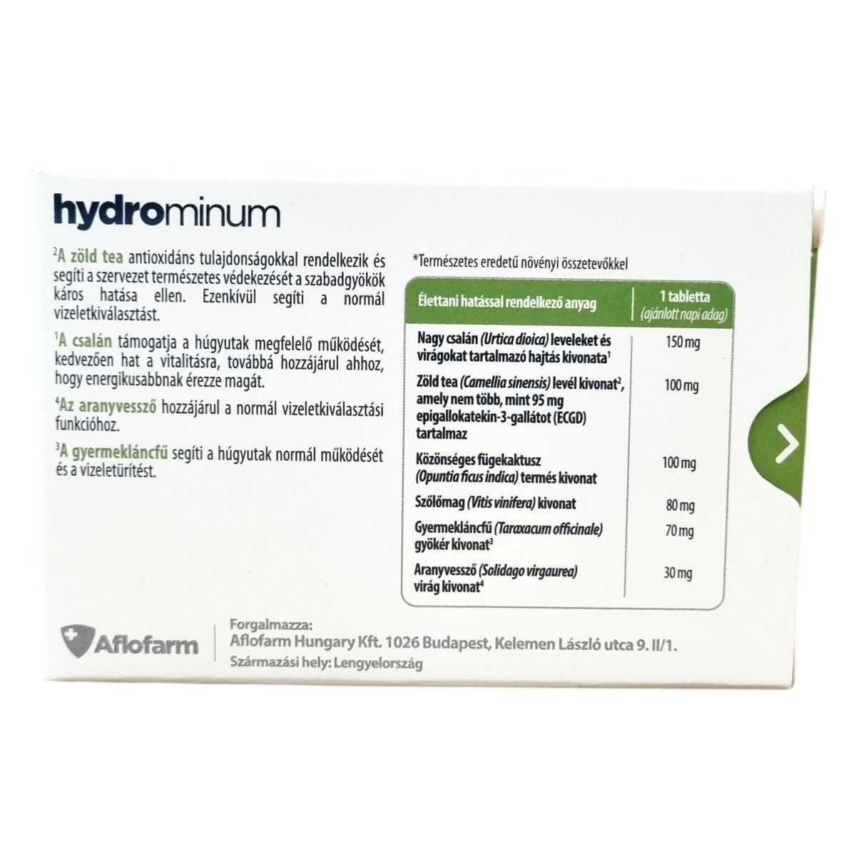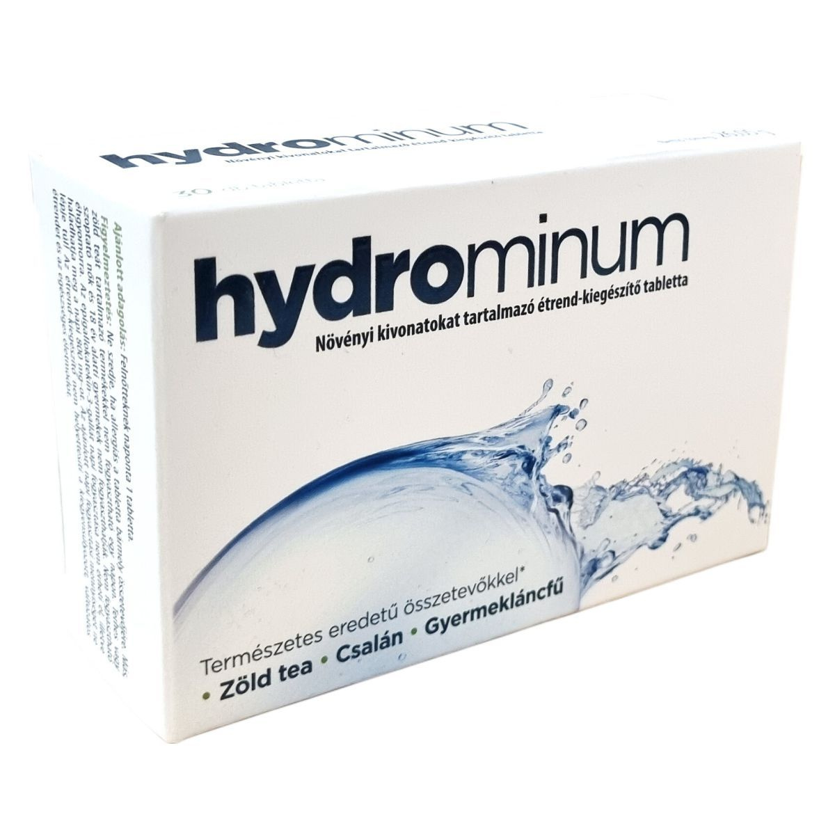 A Hydrominum étrend-kiegészítő tabletta természetes eredetű növényi kivonatokat tartalmaz. A csalán és a gyermekláncfű támogatja a húgyutak normál működését, a zöld tea antioxidáns tulajdonságokkal rendelkezik, míg az aranyvessző hozzájárul a normál vizeletkiválasztási funkcióhoz.