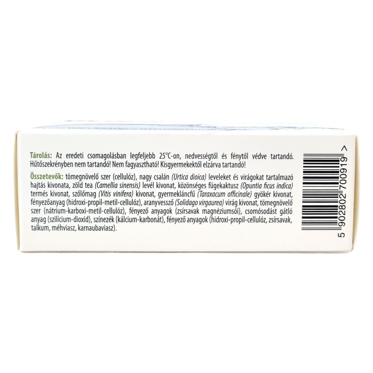tömegnövelő szer (cellulóz), nagy csalán (Urtica dioica) leveleket és virágokat tartalmazó hajtás kivonata, zöld tea (Camellia sinensis) levél kivonat, közönséges fügekaktusz (Opuntia ficus indica) termés kivonat, szőlőmag (Vitis vinifera) kivonat, gyermekláncfű (Taraxacum officinale) gyökér kivonat, fényezőanyag (hidroxi-propil-metil-cellulóz), aranyvessző (Solidago virgaurea) virág kivonat, tömegnövelő szer (nátrium-karboxi-metil-cellulóz), fényező anyagok (zsírsavak magnéziumsói), csomósodást gátló anyag (szilícium-dioxid), színezék (kalcium-karbonát), fényező anyagok (hidroxi-propil-cellulóz, zsírsavak, talkum, méhviasz, karnaubaviasz)