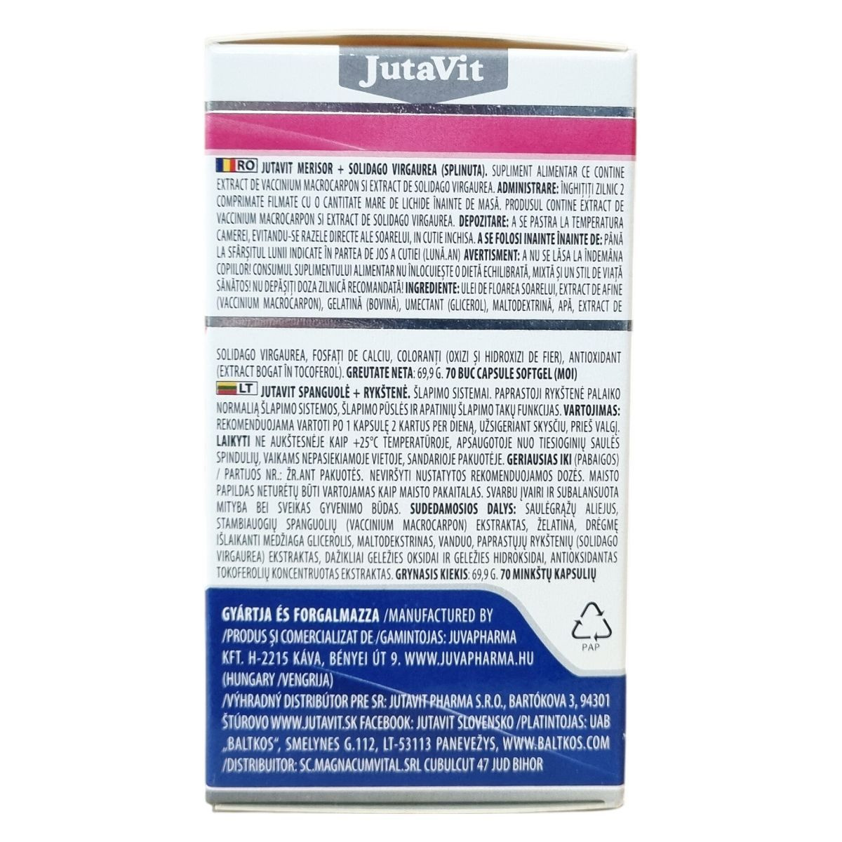 A JutaVit Tőzegáfonya + Aranyvessző kivonat lágyzselatin kapszulában található étrend-kiegészítő készítmény Vaccinium macrocarpon (tőzegáfonya) és Solidago virgaurea (aranyvessző) kivonatot tartalmaz. A napi adag két lágykapszula, melyeket étkezés előtt ajánlott bő folyadékkal lenyelni. A termék összetevői között napraforgóolaj, marha eredetű zselatin, valamint antioxidánsként tokóferolban gazdag kivonat szerepel. A készítményt szobahőmérsékleten, napfénytől védve, gyermekektől elzárva kell tárolni. A táplálékkiegészítő nem helyettesíti a változatos étrendet és az egészséges életmódot, illetve az ajánlott napi adagot nem szabad túllépni. A termék nettó tömege 69,9 g, mely 70 darab lágyzselatin kapszulát tartalmaz. A gyártó a Juvapharma Kft., Magyarország.