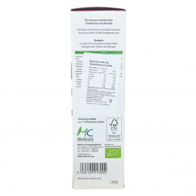 A medicura® Cranberry tiszta, préselt tőzegáfonya levet tartalmaz, amely ellenőrzött biogazdálkodásból származik és Kanadából származó friss termésből készül. A tőzegáfonya fontos része egy egészséges étrendnek, a termék vegán és bio minősítésű. A csomagolás FSC tanúsítvánnyal rendelkezik, támogatva a fenntartható erdőgazdálkodást. A palack tartalma körülbelül 11 adag 30 ml-enként.