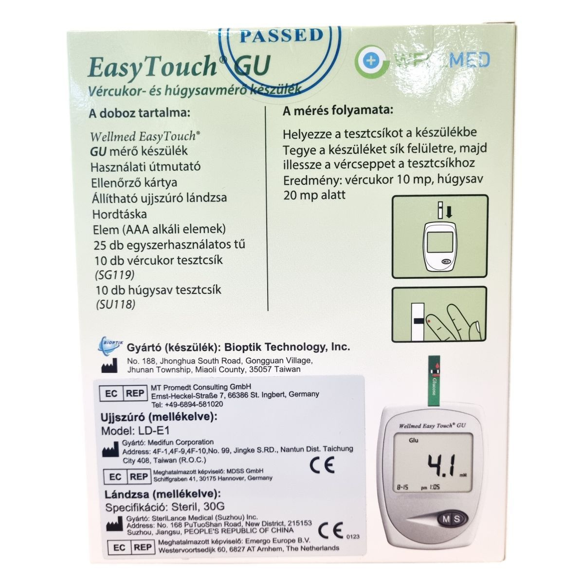 A készülék nagyméretű LCD kijelzővel rendelkezik, automatikus tesztcsík-azonosítást alkalmaz, és memóriája 200 vércukor- és 100 húgysavmérési eredmény tárolására alkalmas. A mérési idő vércukor esetén 10 mp, húgysav esetén 20 mp. A doboz tartalma: Wellmed EasyTouch® GU mérőkészülék, használati útmutató, ellenőrző kártya, állítható ujjbegyszúró lándzsa, hordtáska, AAA alkáli elemek, 25 db egyszerhasználatos tű, 10 db vércukor tesztcsík (SG119) és 10 db húgysav tesztcsík (SU118). Származási hely: Taiwan. REF: MG205-1E, REV.A3 02/23, P/N 12010365, SN: 20125820A0018.