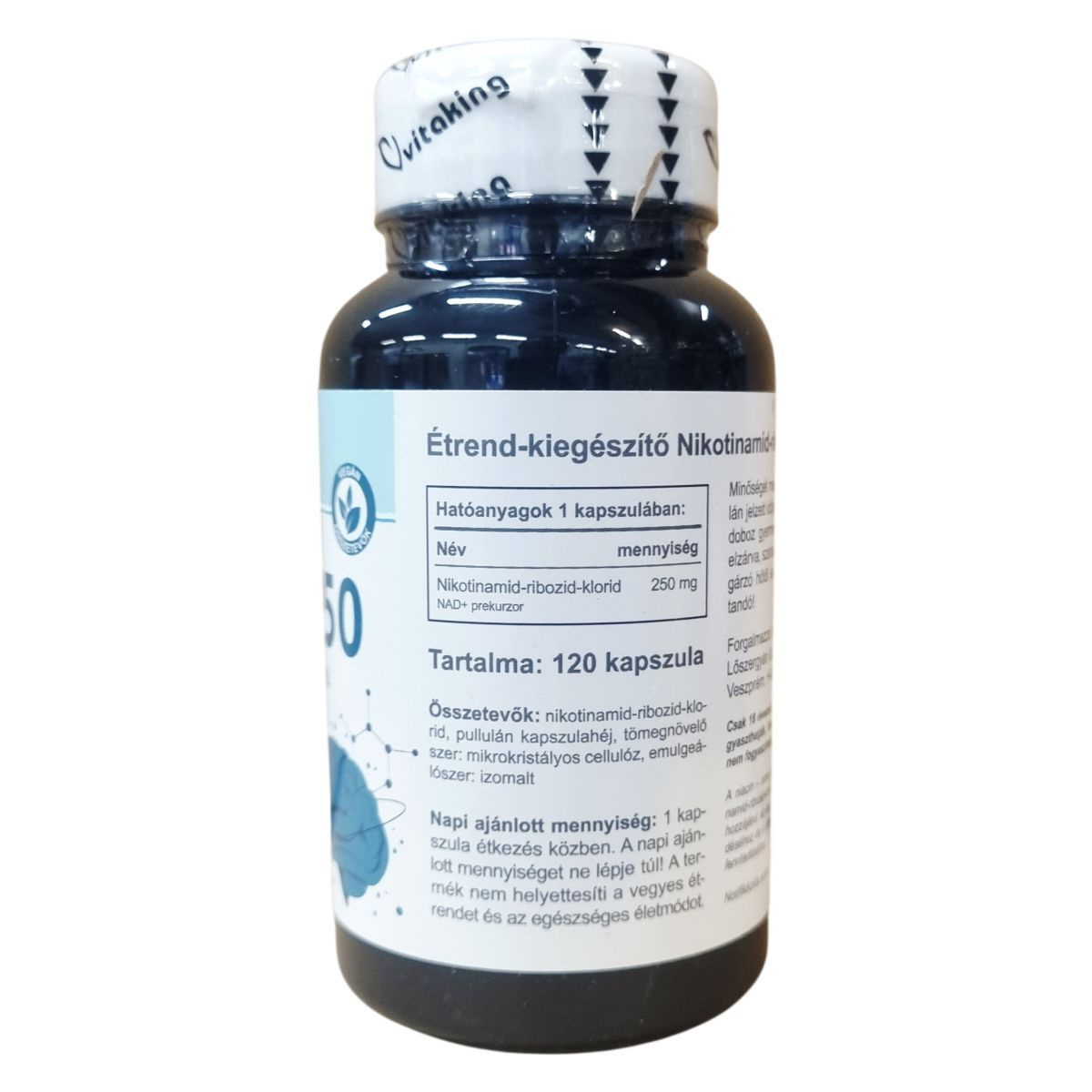A 120 db-os étrend-kiegészítő nikotinamid-ribozid-klorid hatóanyaggal, amely NAD+ prekurzor. A niacin – amely a készítményben nikotinamid-ribozid-klorid formájában van jelen – hozzájárul az idegrendszer normál működéséhez és a normál pszichológiai funkció fenntartásához. Tartalma: 60 kapszula. Minőségét megőrzi a doboz oldalán jelzett időpontig (nap/hó/év).