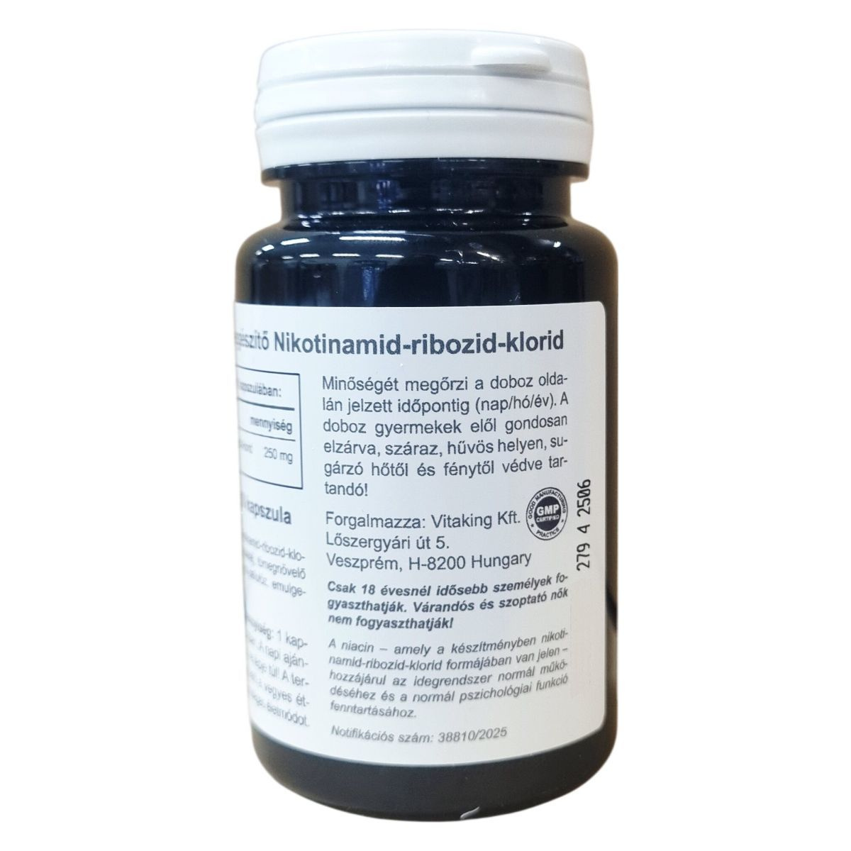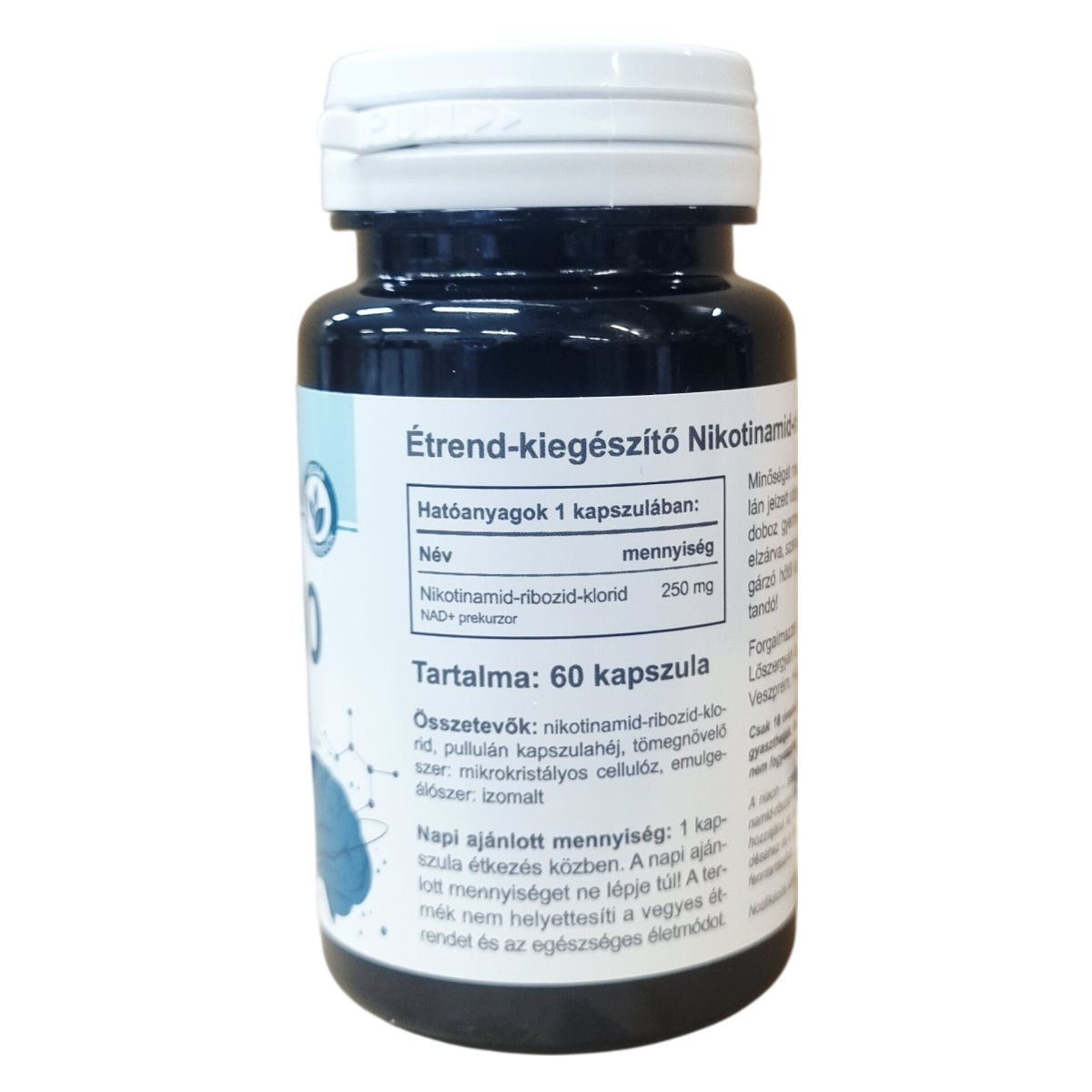 A 60 db-os étrend-kiegészítő nikotinamid-ribozid-klorid hatóanyaggal, amely NAD+ prekurzor. A niacin – amely a készítményben nikotinamid-ribozid-klorid formájában van jelen – hozzájárul az idegrendszer normál működéséhez és a normál pszichológiai funkció fenntartásához. Tartalma: 60 kapszula. Minőségét megőrzi a doboz oldalán jelzett időpontig (nap/hó/év).