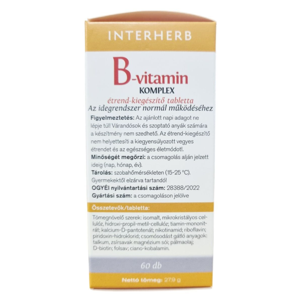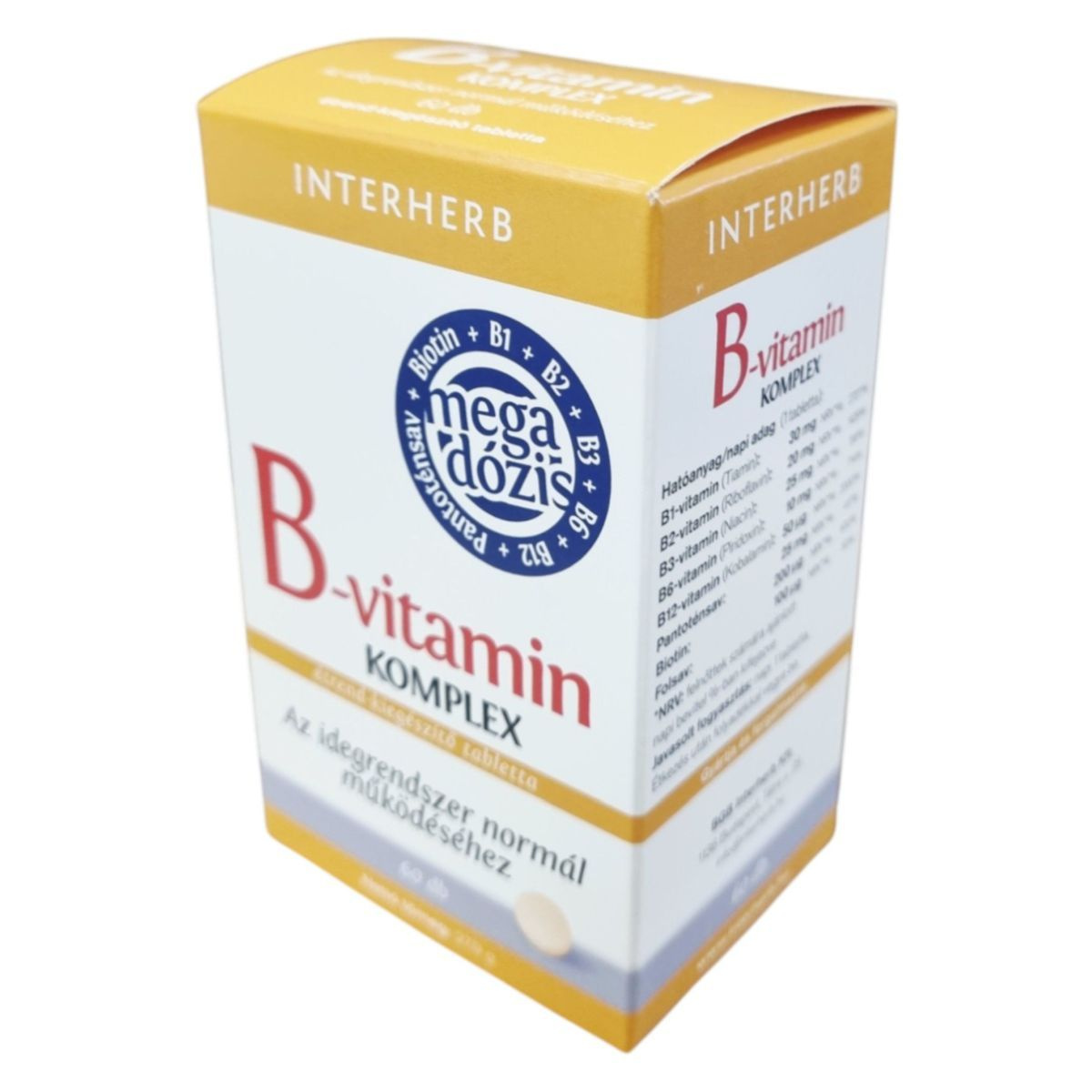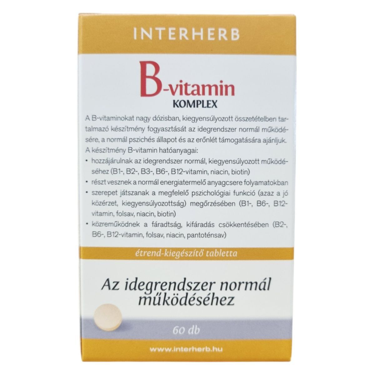 Az INTERHERB B-vitamin KOMPLEX étrend-kiegészítő tabletta célja, hogy támogassa az idegrendszer normál működését és a pszichés állapot fenntartását. A termék nagy dózisban tartalmazza a B-vitaminokat, amelyek hozzájárulhatnak az energiatermelő anyagcsere folyamatokhoz és a fáradtság csökkentéséhez. A készítmény összetevői között megtalálható a tiamin, riboflavin, niacin, piridoxin, kobalamin, pantoténsav, biotin és folsav. A termék 60 tablettát tartalmaz, és napi 1 tabletta fogyasztása ajánlott étkezés után. Fontos, hogy az ajánlott napi adagot ne lépje túl, és a termék nem helyettesíti a kiegyensúlyozott étrendet és az egészséges életmódot.
