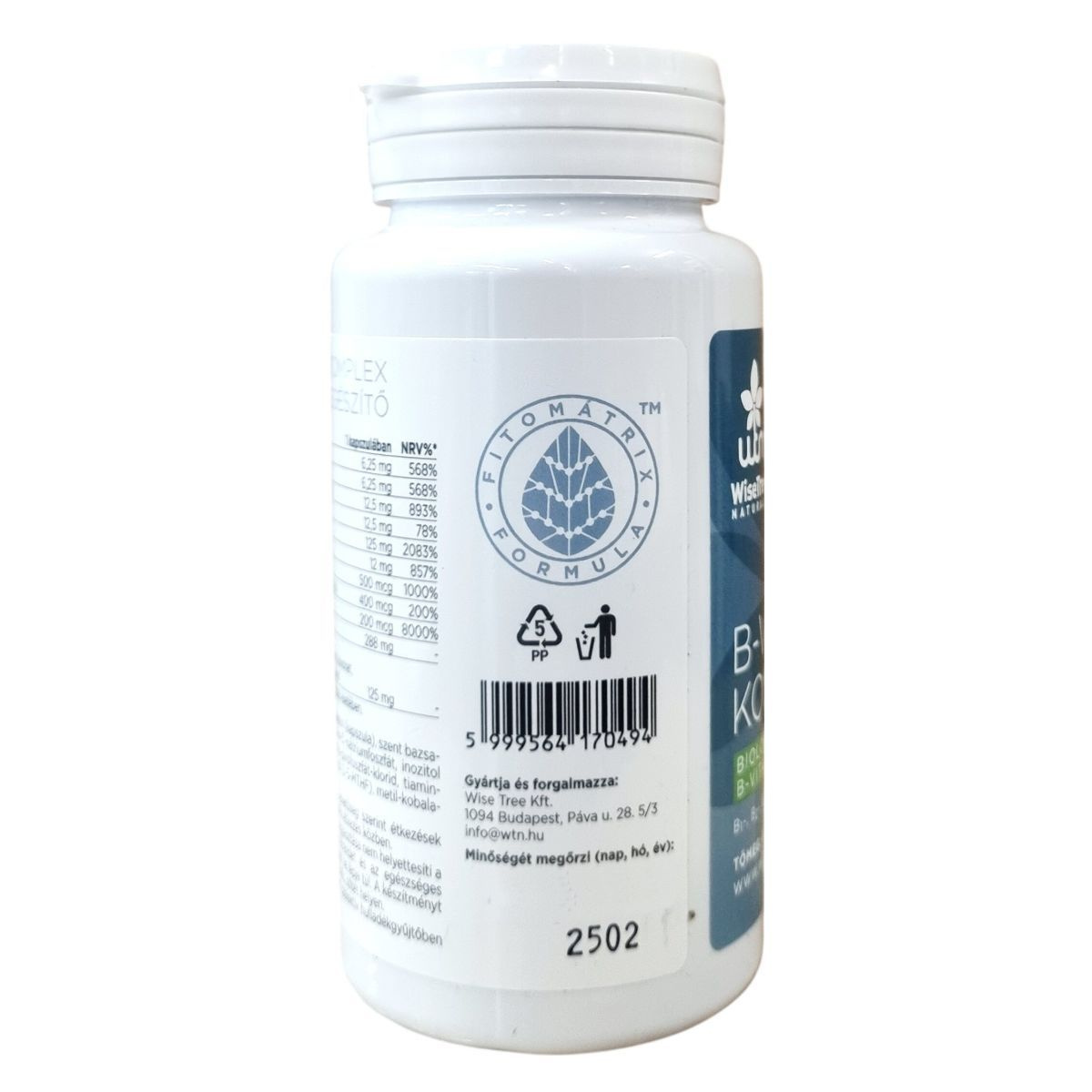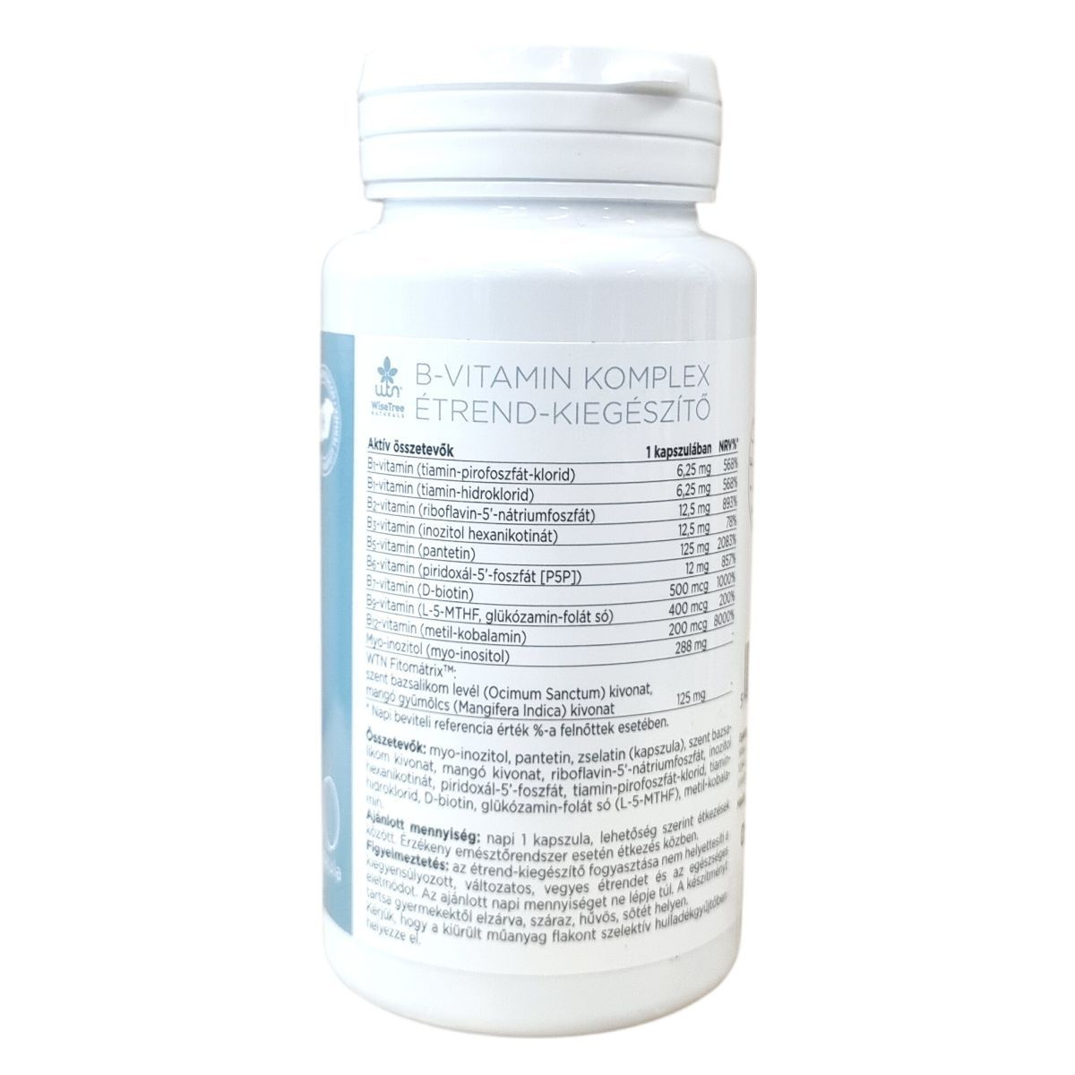 A WiseTree Naturals B-vitamin komplex étrend-kiegészítő kapszula biológiailag aktív B-vitaminokat tartalmaz, mint a tiamin-pirofoszfát-klorid és tiamin-hidroklorid (B1-vitamin), riboflavin-5'-nátriumfoszfát (B2-vitamin), inozitol hexanikotinat (B3-vitamin), pantetin (B5-vitamin), piridoxál-5'-foszfát (B6-vitamin), D-biotin (B7-vitamin), L-5-MTHF, glükózamin-folát só (B9-vitamin) és metil-kobalamin (B12-vitamin). Egy kapszula továbbá 288 mg myo-inozitol és a WTN Fitomátrix™ formula részeként szent bazsalikom levél és mangó gyümölcs kivonatát tartalmazza. A termék formája zselatin kapszula, a csomagolás 60 kapszulát tartalmaz. Az aktív hatóanyagok mennyisége jelentősen meghaladja a napi beviteli referencia értéket. A készítmény a kiegyensúlyozott táplálkozás részét képezheti, és ajánlott a napi egy kapszula fogyasztása, lehetőség szerint étkezések között, vagy érzékeny emésztőrendszer esetén étkezés közben. A kapszula támogatni tudja a szervezet B-vitamin ellátását, és hozzájárulhat az anyagcseréhez, idegrendszer működéséhez, valamint az energiaszint fenntartásához.