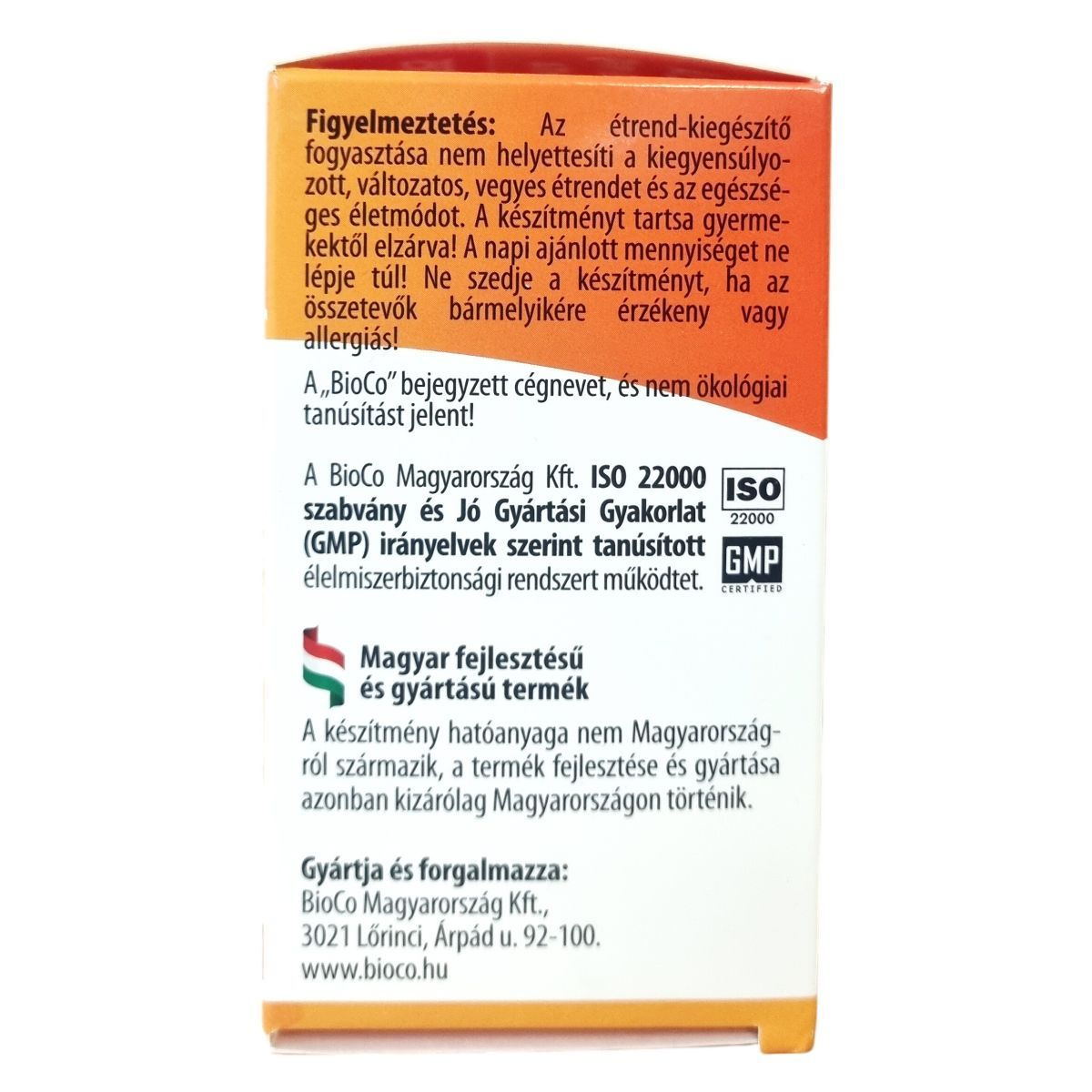 Az étrend-kiegészítő fogyasztása nem helyettesíti a kiegyensúlyozott, változatos, vegyes étrendet és az egészséges életmódot. A készítményt tartsa gyermekektől elzárva! A napi ajánlott mennyiséget ne lépje túl! Ne szedje a készítményt, ha az összetevők bármelyikére érzékeny vagy allergiás! A „BioCo” bejegyzett cégnevet, és nem ökológiai tanúsítást jelent!