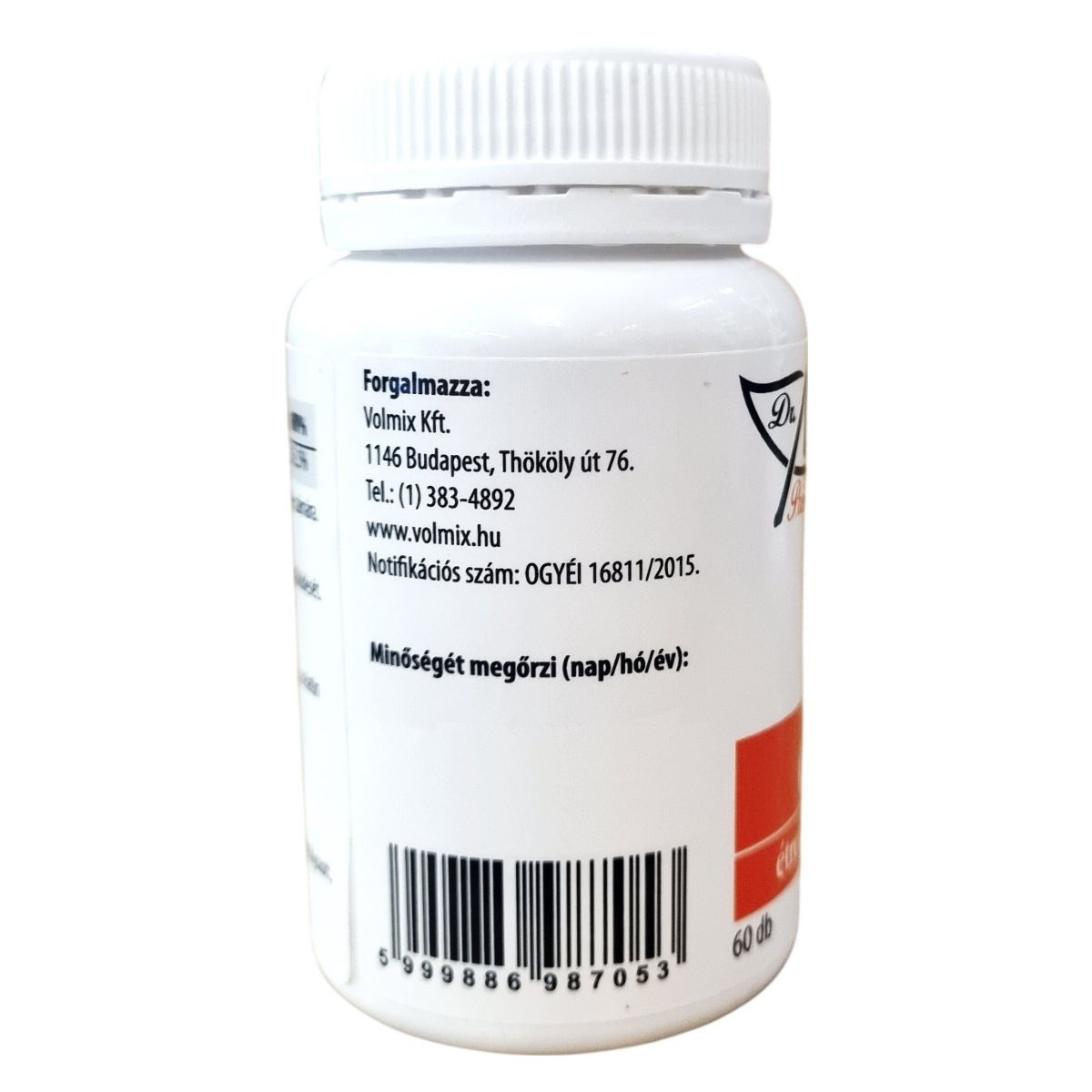 A termék nettó tömege a csomagoláson fel van tüntetve, és 60 darab kapszulát tartalmaz. A napi adagban található 450 mg C-vitamin a felnőttek számára ajánlott napi táplálkozási referencia érték több mint 560%-át fedezheti. A liposzómás technológia révén a C-vitamin hatékonyabb felszívódása érhető el. A termék minőségét a csomagoláson található minőségmegőrzési időig tartja meg. A képen szereplő vonalkód azonosító és a forgalmazó adatai megerősítik a termék eredetét. A fogyasztók számára fontos, hogy figyeljenek az ajánlott adag betartására és a termék használata mellett fenntartsák a kiegyensúlyozott étrendet és életmódot.
