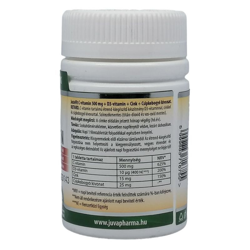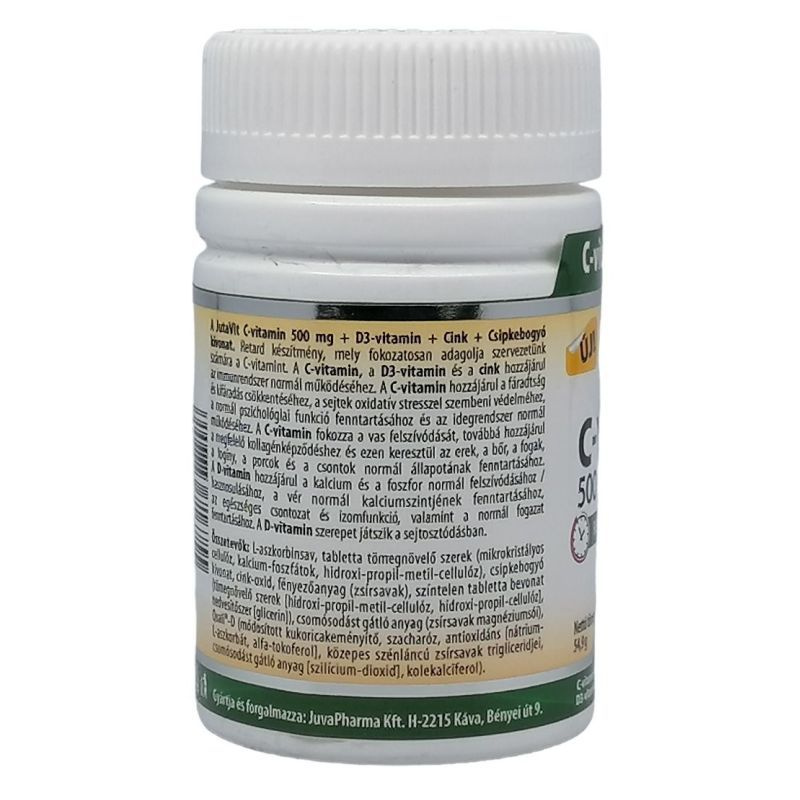 A JutaVit C-vitamin 500 mg + csipkebogyó kivonat + D3-vitamin, nyújtott felszívódású készítmény, mely fokozatosan adagolja szervezetünk számára a C-vitamint.