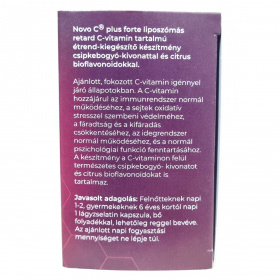 A Novo C® plus forte liposzómás retard C-vitamin készítmény természetes foszfolipid burkolattal készült, amely lehetővé teheti a C-vitamin könnyebb sejtekbe jutását és jobb hasznosulását. A C-vitamin hozzájárulhat az immunrendszer normál működéséhez, a sejtek oxidatív stresszel szembeni védelméhez, a fáradtság és kifáradás csökkentéséhez, az idegrendszer normál működéséhez, a pszichológiai funkciók fenntartásához, valamint a normál kollagénképződéshez, amely a porcok, erek, csontozat, fogíny és bőr egészségéért felelős. Továbbá fokozhatja a vas felszívódását, és támogathatja a normál energiatermelő anyagcsere-folyamatokat. A termék csipkebogyó-kivonatot és citrus bioflavonoidokat is tartalmaz, amelyek a C-vitamin hatását kiegészíthetik.
