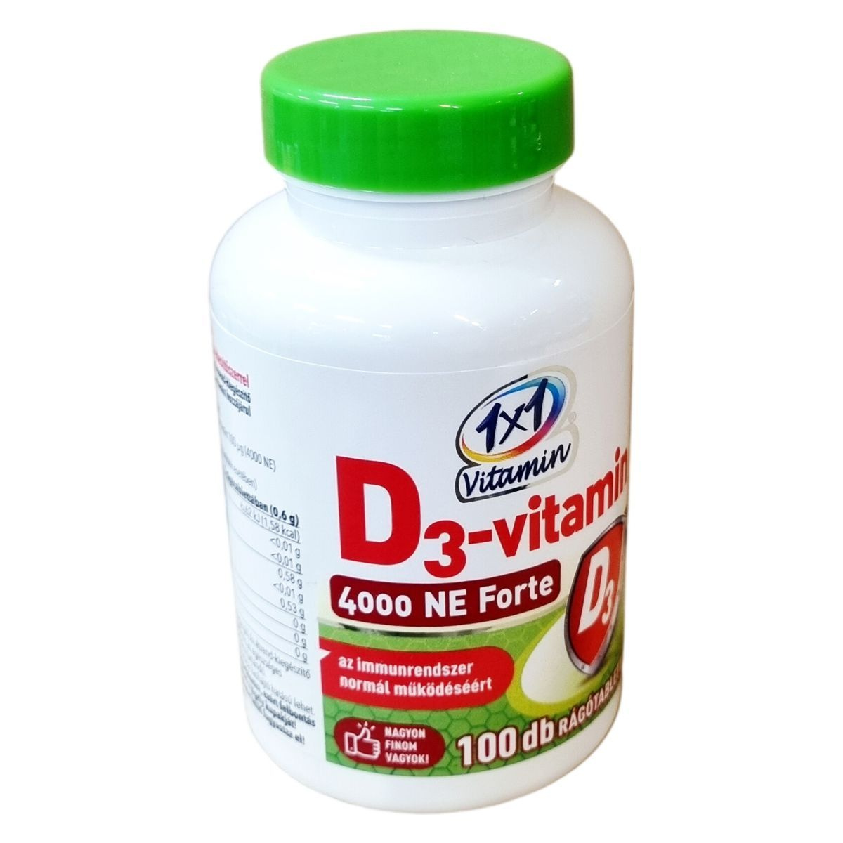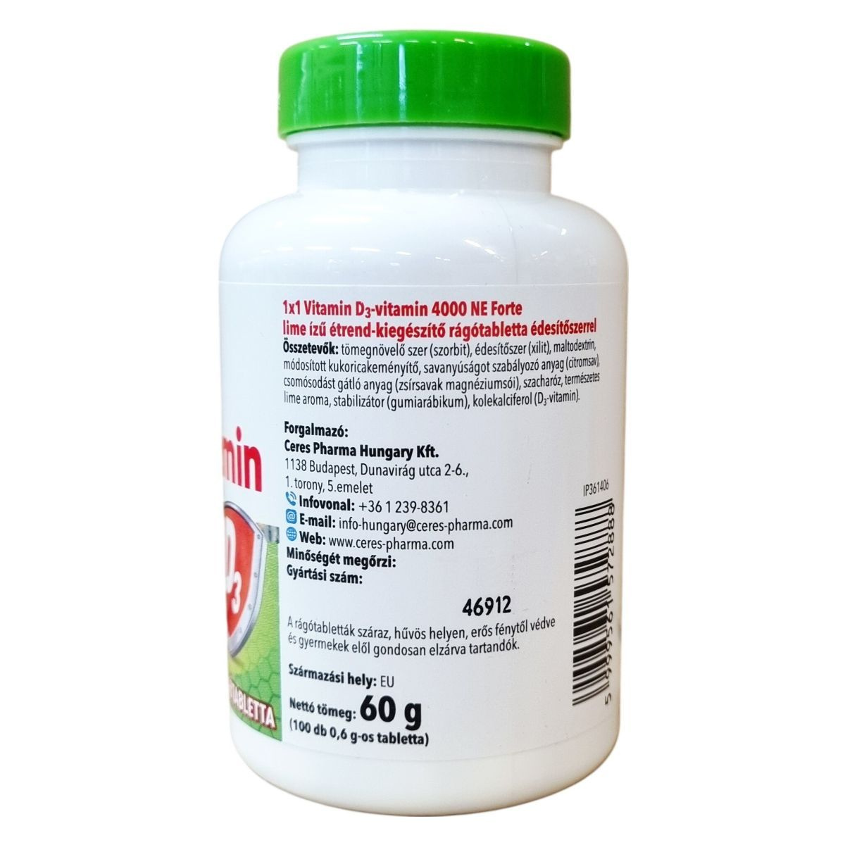 Az 1x1 Vitamin D3-vitamin 4000 NE Forte lime ízű étrend-kiegészítő rágótabletta 4000 NE D3-vitamint tartalmaz. A termék cukoralkoholokat is tartalmaz, így túlzott fogyasztása hashajtó hatást válthat ki. Nettó tömege 60 g, amely 100 darab 0,6 g-os tablettát jelent. A termék származási helye az Európai Unió.
