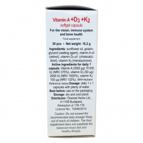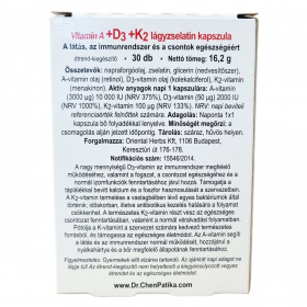A nagy mennyiségű D3-vitamin az immunrendszer megfelelő működéséhez, valamint a fogazat, a csontrendszer egészségéhez és a normál izomfunkciók fenntartásához járul hozzá. Támogatja a táplálékkal bevitt kalcium és a foszfor hasznosulását a szervezetben. A K2-vitamin termelése a vastagbélben lévő egyes baktériumok által történik; időskorban, illetve antibiotikus kezelés hatására a folyamat csökkenhet. A természetes K2-vitamin részt vesz az egészséges csontrendszer fenntartásában, valamint a normál véralvadási folyamatban. Pótolja a K-vitamint a szervezet számára kedvező természetes forrásból, és támogassa az egészséges életmódot. Az A-vitamin segíti a látás és az immunrendszer normál működését, hozzájárul a nyálkahártya és a bőr megfelelő állapotának fenntartásához.