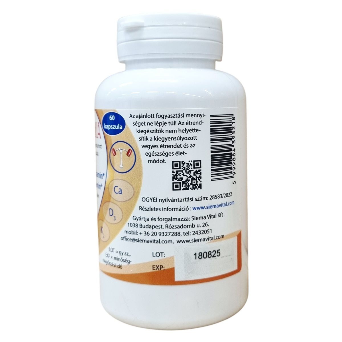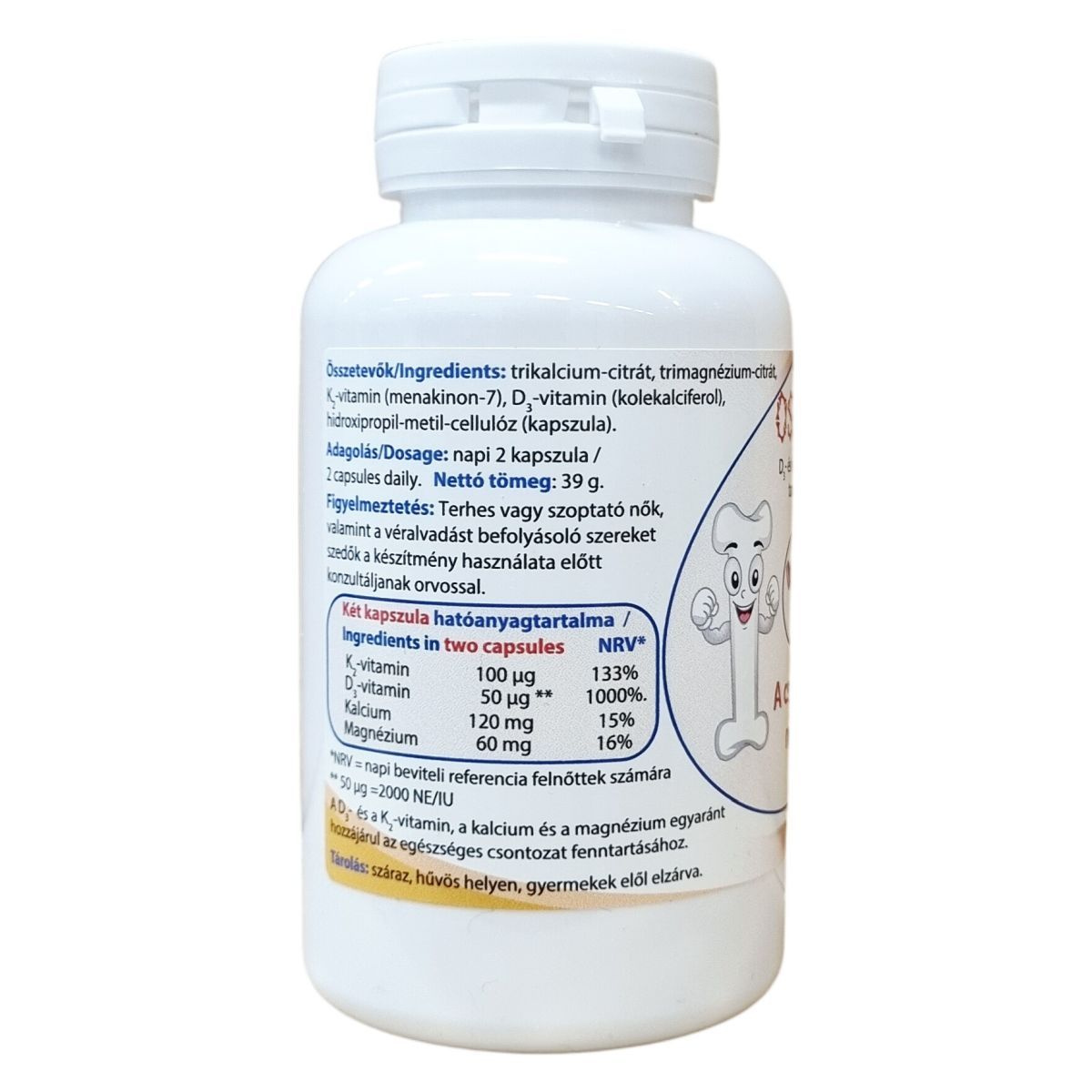 A termék két kapszulája 2000 NE D3-vitamint, 100 μg K2-vitamint, 120 mg kalciumot és 60 mg magnéziumot tartalmaz. Ezek a tápanyagok együttesen hozzájárulhatnak az egészséges csontozat fenntartásához, így támogathatják a csontegészség négy pillérének megőrzését. Az étrend-kiegészítők nem helyettesítik a kiegyensúlyozott, vegyes étrendet és az egészséges életmódot. A terméket gyermekek elől elzárva, száraz és hűvös helyen kell tárolni. Az ajánlott napi mennyiséget nem szabad túllépni.