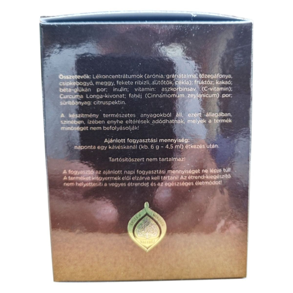 Lékivonatok (arónia, gránátalma, tőzegáfonya, csipkebogyó, meggy, fekete ribizli, sütőtök, cékla); fruktóz; kakaó; béta-glükán por; inulin; vitamin: aszkorbinsav (C-vitamin); Curcuma Longa-kivonat; fahéj (Cinnamomum zeylanicum) por, sűrítőanyag: citruspektin.
