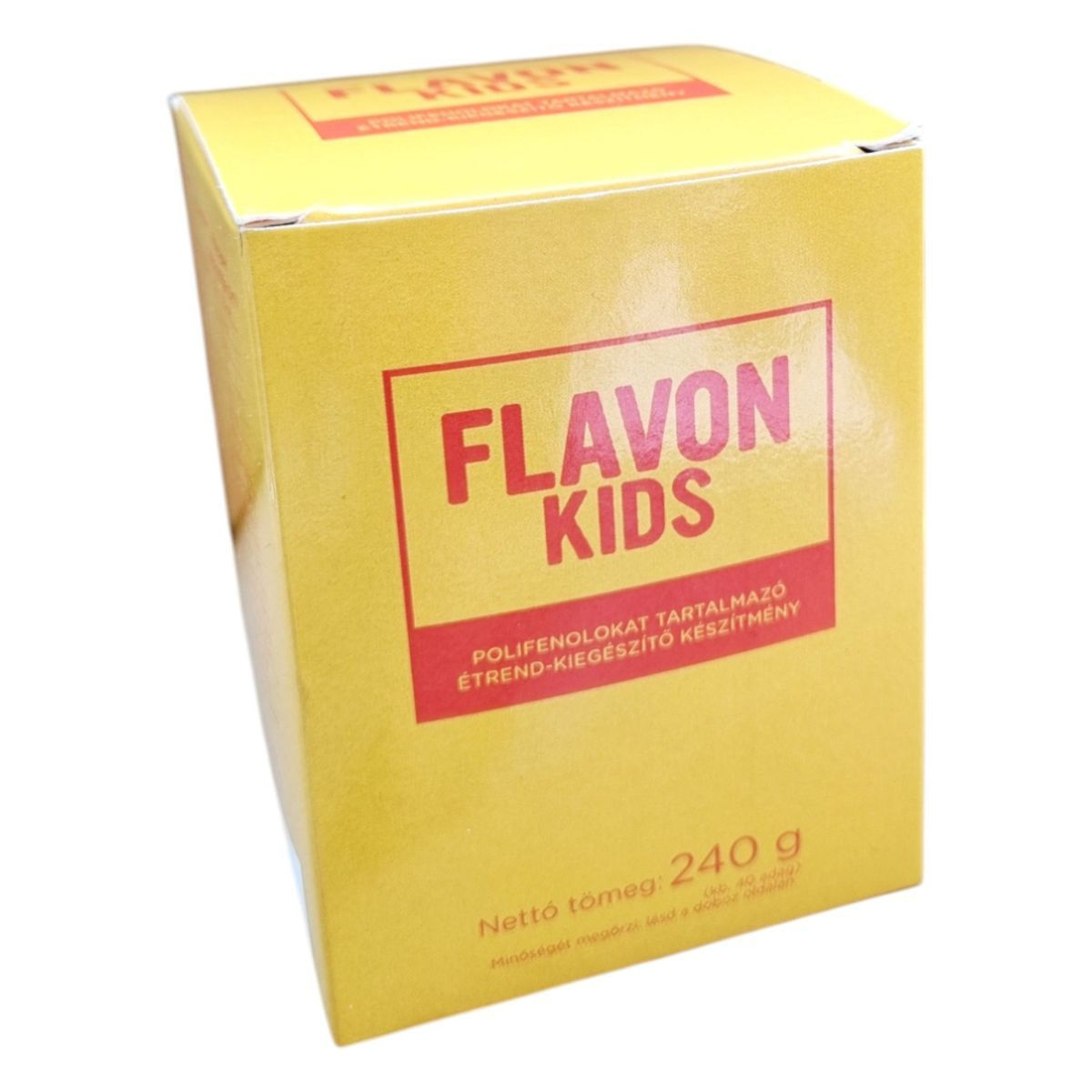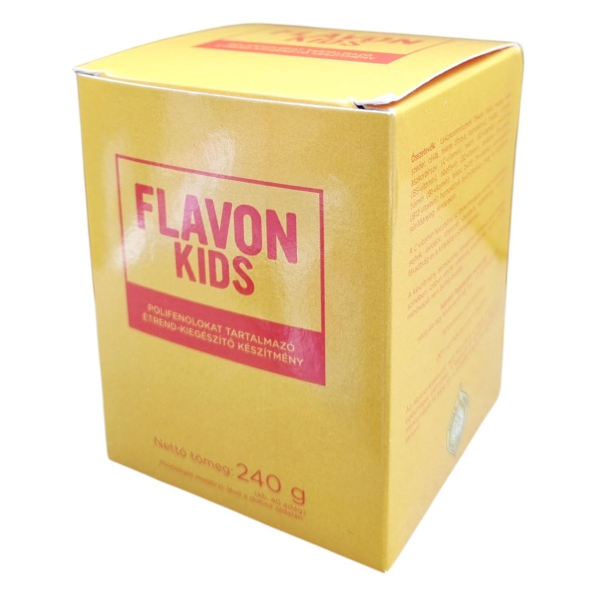 A Flavon Kids egy polifenolokat tartalmazó étrend-kiegészítő, amely különféle gyümölcsök lékoncentrátumait és vitaminokat tartalmazhat. A termék hozzájárulhat az immunrendszer normál működéséhez és a sejtek oxidatív stresszel szembeni védelméhez. A készítmény természetes anyagokat tartalmaz, ezért állagában, színében, ízében enyhe eltérések adódhatnak, melyek a termék minőségét nem befolyásolják. A termék tartósítószert nem tartalmaz, és ajánlott napi fogyasztási mennyisége egy kávéskanál étkezés után. A termék nem helyettesíti a vegyes étrendet és az egészséges életmódot, és kisgyermek elől elzárva tartandó.
