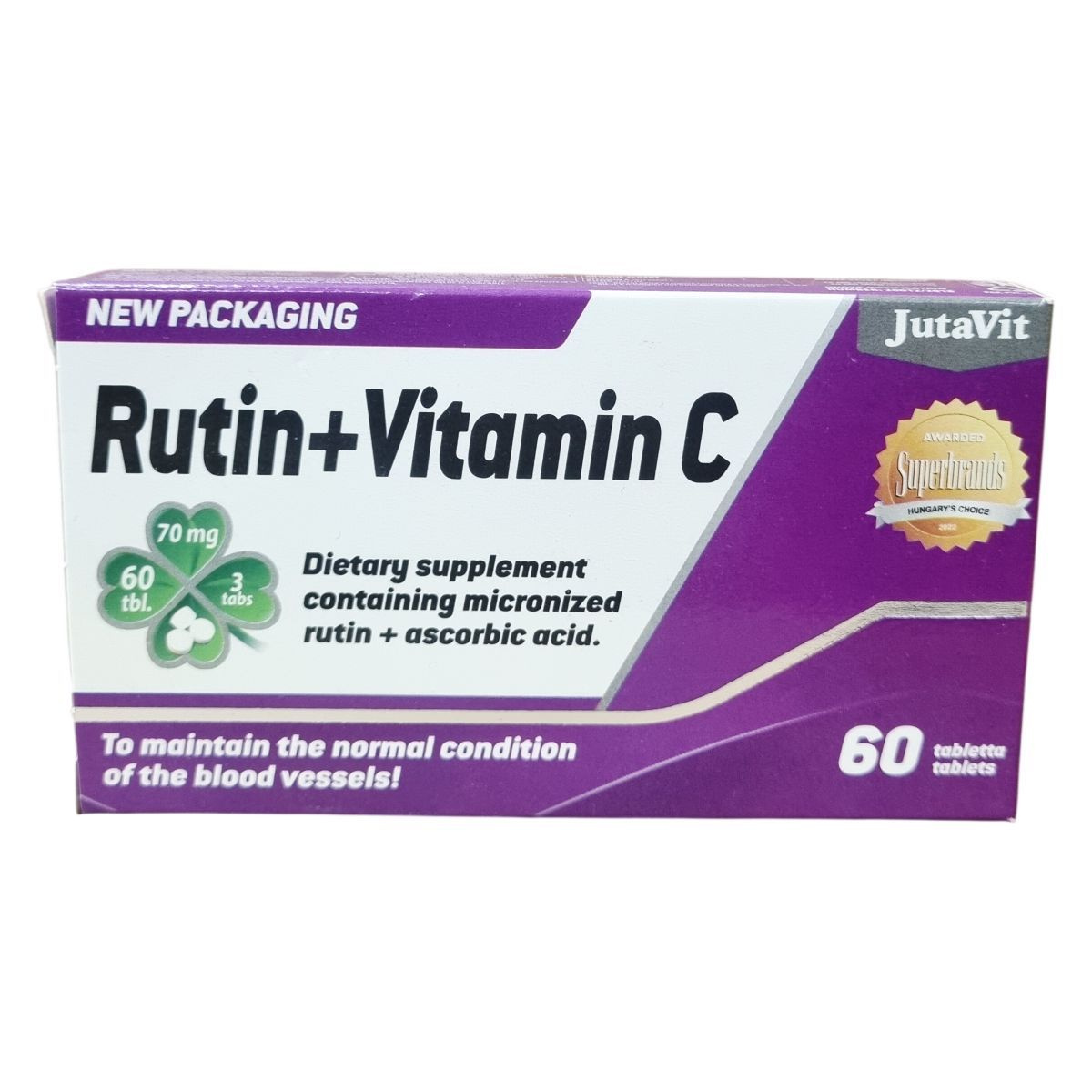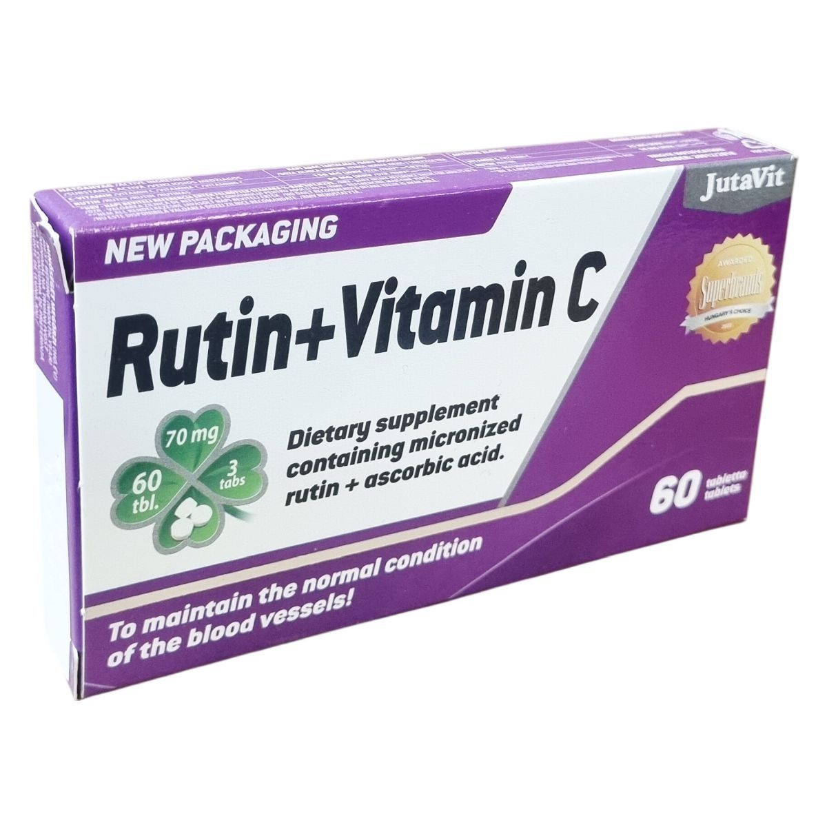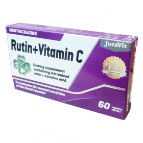A JutaVit Rutin+Vitamin C egy komplex étrend-kiegészítő, amely mikronizált rutint és C-vitamint tartalmaz. A rutin tiszta formában Szent-Györgyi Albert által került izolálásra, aki annak hatását a C-vitaminnal együtt vizsgálta. A C-vitamin hozzájárulhat a megfelelő kollagénképződéshez, ezen keresztül az erek, a bőr, a fogak, a fogíny, a porcok és a csontozat normál állapotának fenntartásához. Támogathatja az immunrendszer normál működését, a normál pszichológiai funkciók fenntartását és az idegrendszer normál működését. Emellett elősegítheti a vas felszívódását. Az adagolás napi három tabletta, melyet vízzel kell lenyelni. A terméket szobahőmérsékleten, fénytől védve és zárt dobozban javasolt tárolni. A termék csomagolása 2x30 darabos alu-pvc bliszterekben található. Az összetevők között szerepelnek tömegnövelő szerek, L-aszkorbinsav, rutin, csomósodást gátló anyagok, fényező anyag és nedvesítőszer. A termék fogyasztása nem helyettesíti a kiegyensúlyozott étrendet és az egészséges életmódot. Gyermekektől elzárva kell tartani, és az ajánlott napi adagot nem szabad túllépni.