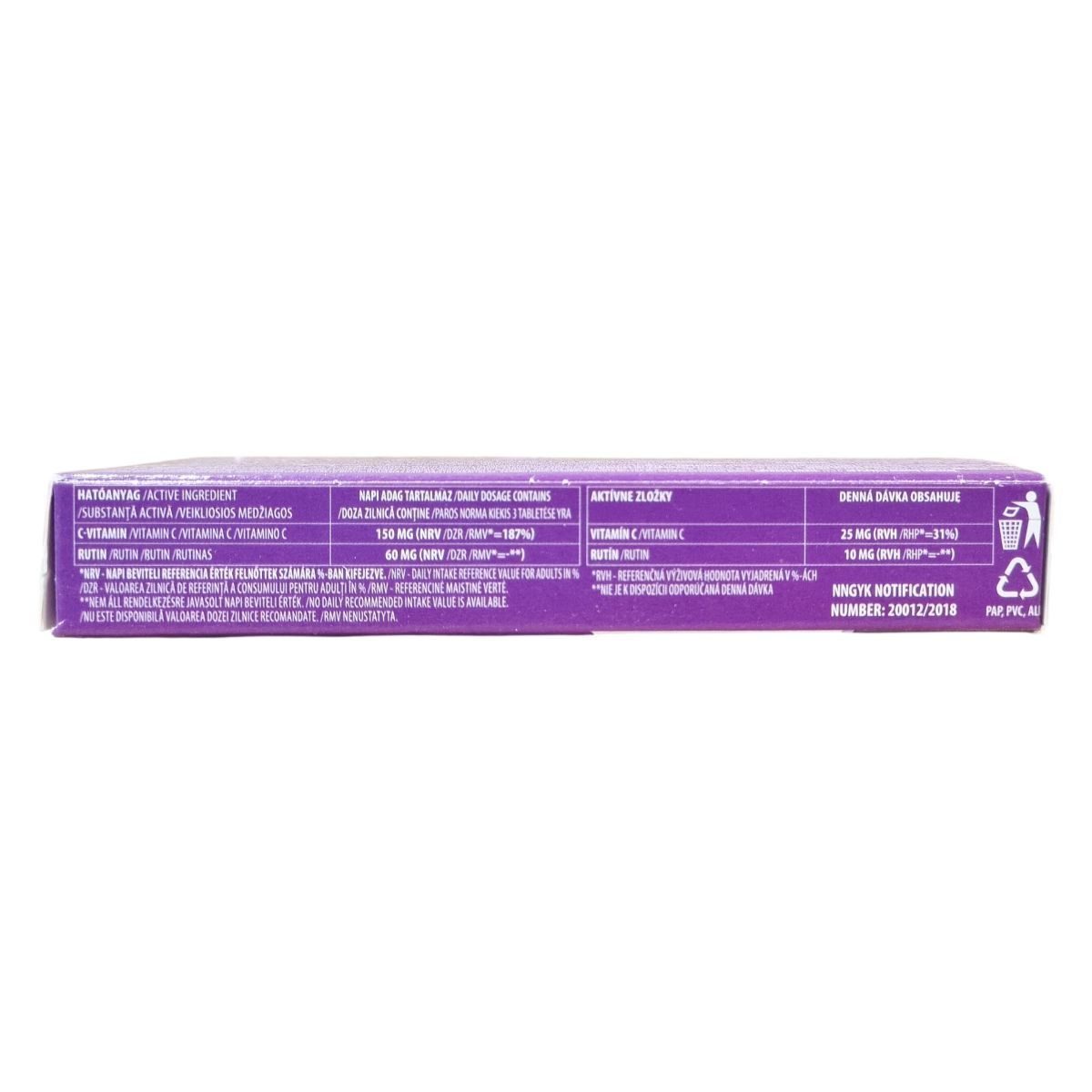 tömegnövelő szerek (mikrokristályos cellulóz, dikalcum-foszfát, hidroxi-propil-metil-cellulóz, hidroxi-propil-cellulóz), L-aszkorbinsav, rutin, csomósodást gátló (zsírsavak magnéziumsói), fényező anyag (zsírsavak), nedvesítőszer (glicerin)