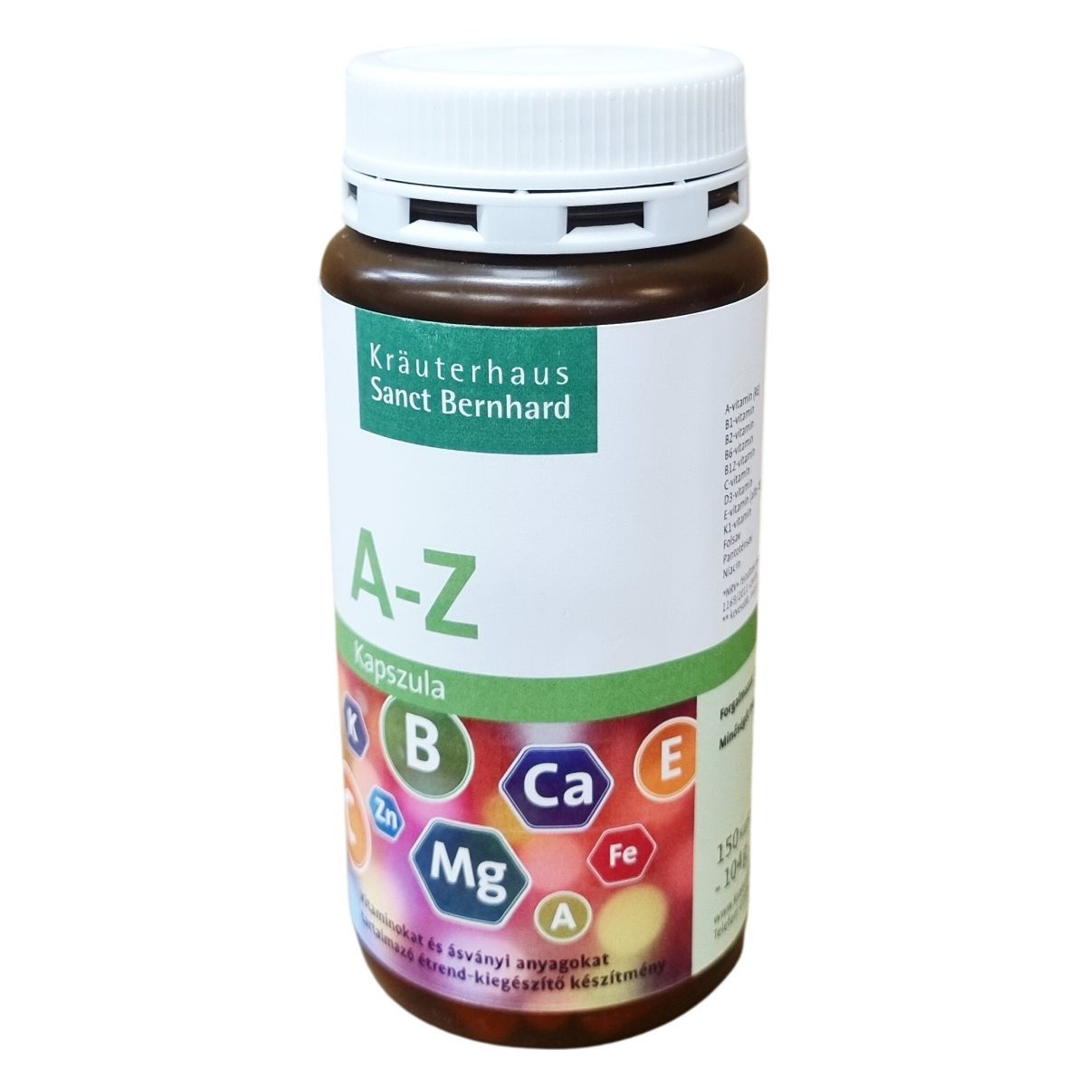 A megfelelő mennyiségű tápanyagok fogyasztása elengedhetetlen a jó közérzethez és a normál teljesítőképességhez. A Sanct Bernhard A-Z kapszula napi egy kapszula adagban részben hozzájárulhat egy felnőtt napi vitamin-, ásványi-anyag- és nyomelem-szükségletéhez. A termék 150 kapszulát tartalmaz, összsúlya 104 gramm. A készítmény Németországban készült, gyártója a Kräuterhaus Sanct Bernhard KG.