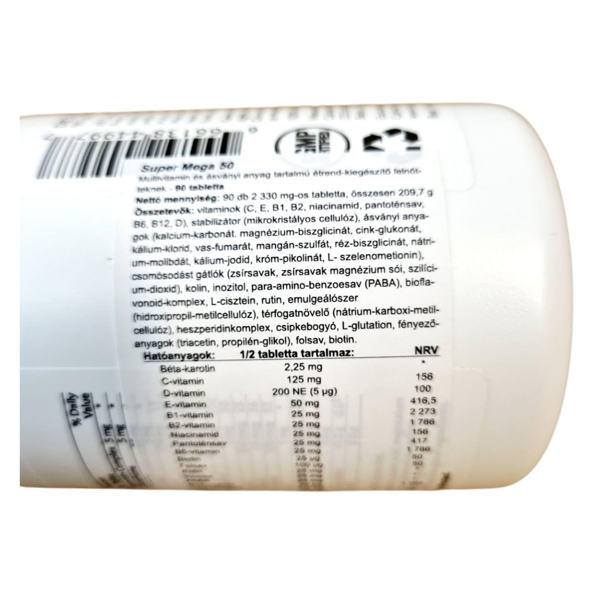 A Super Mega 50 multivitamin és ásványi anyag tartalmú étrend-kiegészítő felnőtteknek készült. Olyan vitaminokat és ásványi anyagokat tartalmazhat, mint a C-vitamin, E-vitamin, B-vitaminok, D-vitamin, kalcium, magnézium, cink, és vas, amelyek hozzájárulhatnak a szervezet egészséges működéséhez.