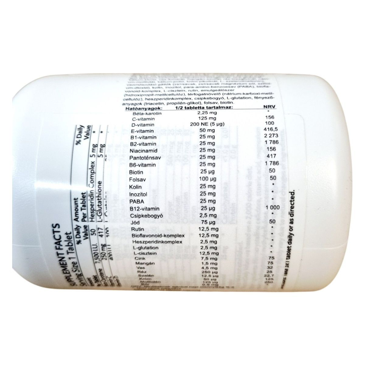 Vitaminok (C, E, B1, B2, niacinamid, pantoténsav, B6, B12, D), stabilizátor (mikrokristályos cellulóz), ásványi anyagok (kalcium-karbonát, magnézium-biszglicinát, cink-glukonát, kálium-klorid, vas-fumarát, mangán-szulfát, réz-biszglicinát, nátrium-molibdát, kálium-jodid, króm-pikolinát, L-szelenometionin), csomósodást gátlók (zsírsavak, zsírsavak magnézium sói, szilícium-dioxid), kolin, inozitol, para-amino-benzoesav (PABA), bioflavonoid-komplex, L-cisztein, rutin, emulgeálószer (hidroxipropil-metilcellulóz), térfogatnövelő (nátrium-karboxi-metil-cellulóz), heszperidinkomplex, csipkebogyó, L-glutation, fényézőanyagok (triacetin, propilén-glikol), folsav, biotin.