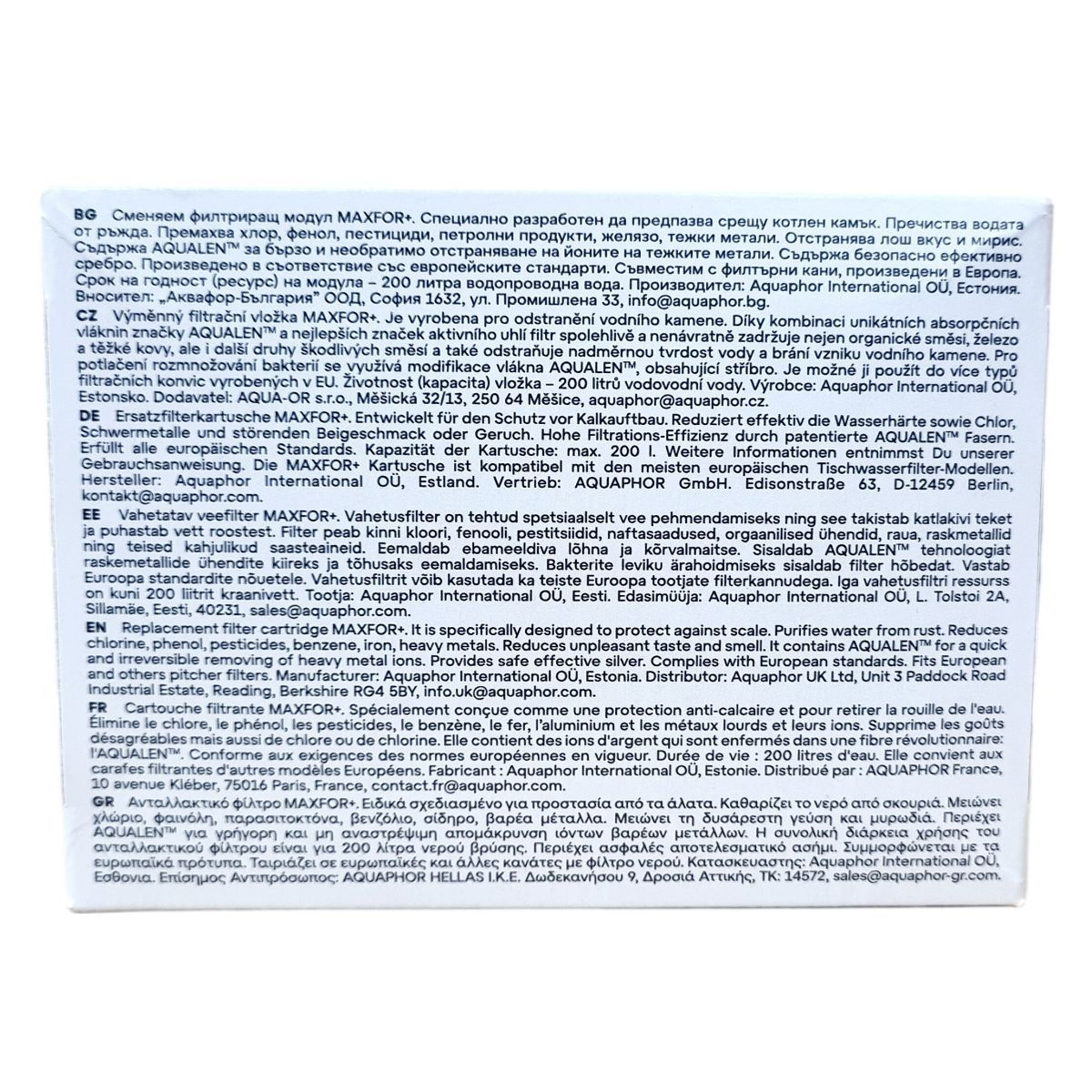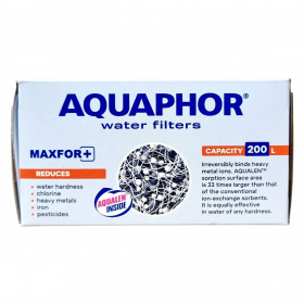 A MAXFOR+ szűrő eltávolítja a vízből a vízkövet, rozsdát, klórt, fenolt, peszticideket, benzolt, vasat és nehézfémeket, valamint kellemetlen íz- és szagrontó anyagokat. A különleges AQUALEN™ szálak gyorsan és visszafordíthatatlanul kötik meg a nehézfém ionokat, miközben az ezüst antibakteriális hatása gátolja a baktériumok elszaporodását. A szűrő teljes kapacitása 200 liter víz tisztítására elegendő, megfelel az európai szabványoknak, és kompatibilis a Brita® Maxtra++ szűrőpatronokkal és más európai márkájú kanna szűrőkkel. A terméket az Aquaphor International OÜ gyártja Észtországban, az importőrök országspecifikusan eltérőek.