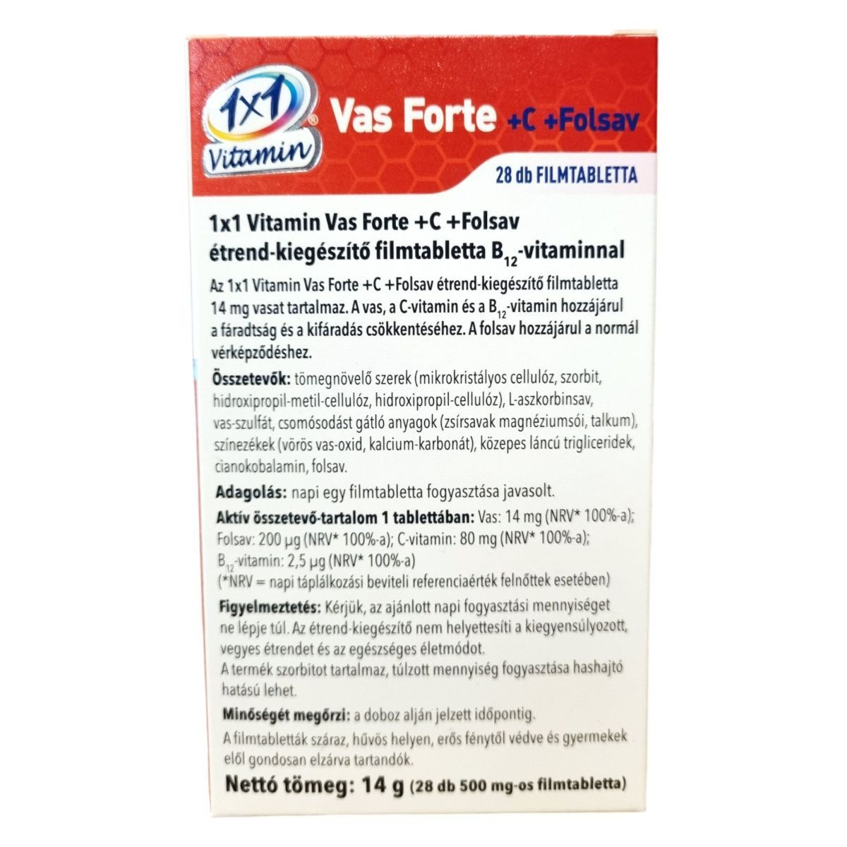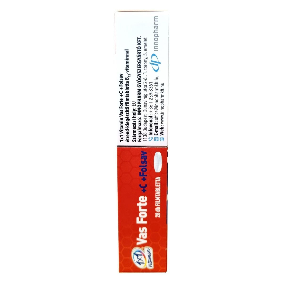 Az 1x1 Vitamin Vas Forte +C +Folsav étrend-kiegészítő filmtabletta vasat, C-vitamint, folsavat és B12-vitamint tartalmaz. Ezek a hatóanyagok együttesen támogathatják a szervezet energiaháztartását és a vérképzést. A vas hozzájárulhat a fáradtság csökkentéséhez, míg a folsav és a B12-vitamin segíthetik a normál vérképződést. A termék napi egy tablettás adagolással könnyen fogyasztható, és ideális választás lehet a fokozott vas- és vitaminigény pótlására. A csomag 28 darab filmtablettát tartalmaz, nettó tömege 14 g. A terméket az Innopharm Gyógyszergyártó Kft. forgalmazza, székhelye Budapest. A filmtabletták szorbitot tartalmaznak, ezért túlzott fogyasztásuk hashajtó hatású lehet.