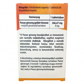 Panax ginseng gyökér kivonatot tartalmazó étrend-kiegészítő tabletta, magas ginzenozid-tartalommal, kimerültség, stressz és koncentrálási nehézség esetén.