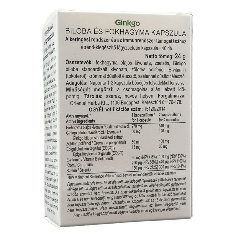 A fokhagyma támogatja az immunrendszer egészséges működését, segít fenntartani a szív és a keringési rendszer egészségét, a megfelelő koleszterin és vérzsír szintet, hozzájárulhat a légúti rendszer egészségének fenntartásához. A zöldtea polifenolok és az E-vitamin antioxidánsként védik a sejteket a szabad gyökök okozta károsító hatásokkal szemben. A króm hozzájárul a normál vércukorszint fenntartásához, részt vesz a makrotápanyagok anyagcseréjében. A szelén hozzájárul az oxidatív stresszel szembeni védelemhez, az immunrendszer és a pajzsmirigy hormonok megfelelő működéséhez, a haj és a köröm normál állapotának fenntartásához. Adagolás (felhasználás): naponta 1-2 kapszula bőséges folyadékkal lenyelve. Összetevők: fokhagyma olajos kivonata, zselatin, Ginkgo Biloba standardizált kivonata, zöldtea polifenol, E-vitamin (tokoferol), krómmal dúsított élesztő, szelénnel dúsított élesztő. Hatóanyagok a napi adagolásra: Hatóanyagok 1 kapszulában: Fokhagyma olajos kivonata 270 mg, Ginkgo Biloba standardizált kivonata 60 mg, zöldtea polifenol 50 mg, E-vitamin (tokoferol) 50mg (NRV 416%), króm 220 µg (NRV 550%), szelén 150 µg (NRV 272%).