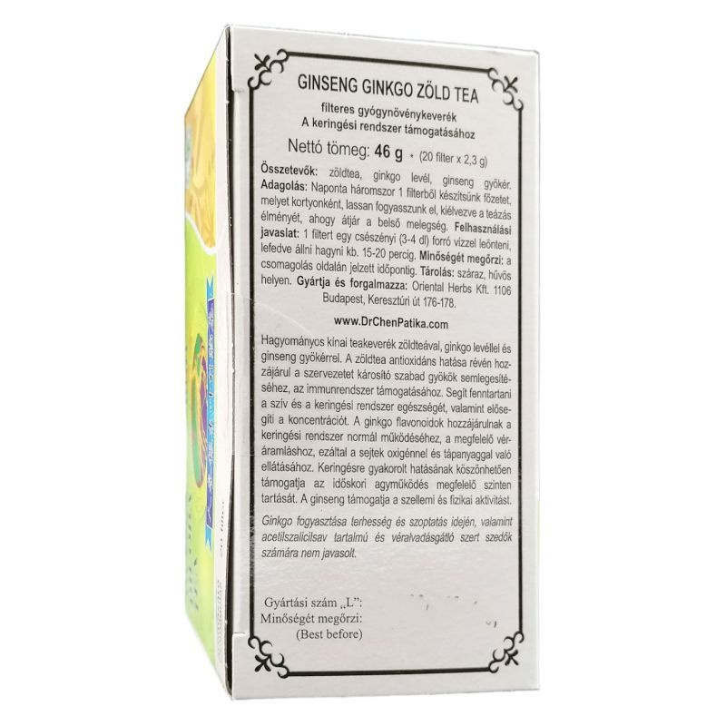 Hagyományos kínai teakeverék zöld teával, ginkgo levéllel és ginseng gyökérrel. A zöldtea antioxidáns hatása révén hozzájárul a szervezetet károsító szabad gyökök semlegesítéséhez, az immunrendszer támogatásához. Segít fenntartani a szív és a keringési rendszer egészségét, valamint elősegíti a koncentrációt. A ginkgo flavonoidok hozzájárulnak a keringési rendszer normál működéséhez, a megfelelő véráramláshoz, ezáltal a sejtek oxigénnel és tápanyaggal való ellátásához. Keringésre gyakorolt hatásának köszönhetően támogatja az időskori agyműködés megfelelő szinten tartását. A ginseng támogatja a szellemi és fizikai aktivitást.