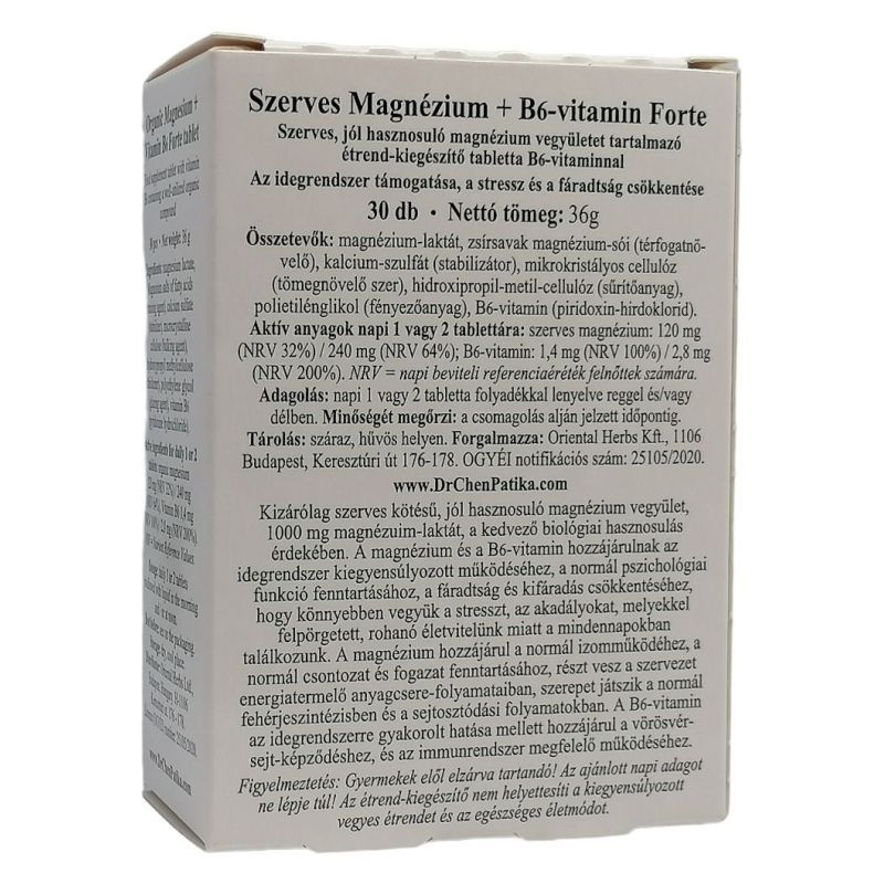 Az étrend-kiegészítő nem helyettesíti a kiegyensúlyozott vegyes étrendet és az egészséges életmódot. adagolás (felhasználás) naponta 1 tabletta folyadékkal lenyelve összetevők magnézium-laktát, térfogatnövelő: magnézium-sztearát, stabilizátor: kalcium-szulfát, tömegnövelő szer: mikrokristályos cellulóz, filmbevonó: HPMC, PEG, B6-vitamin (piridoxin-hidroklorid).