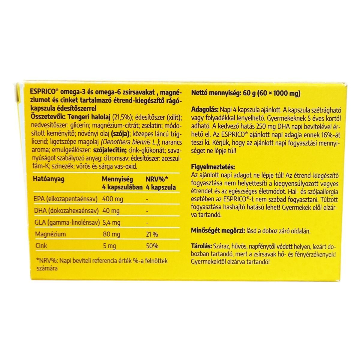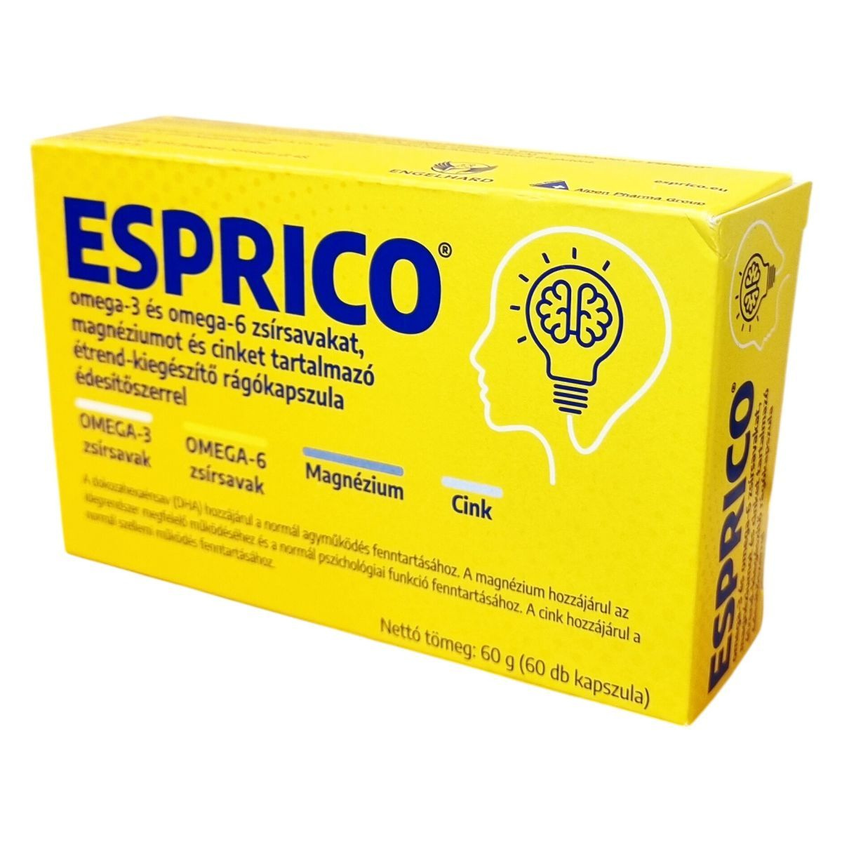 Az ESPRICO® gumírozott kapszulái gyümölcsízűek és többszörösen telítetlen zsírban gazdagok, tartalmaznak omega-3 és omega-6 zsírsavakat, mint a DHA, EPA és GLA. A termék nem tartalmaz tartósítószert, glutamátot, ftalátot, laktózt és glutént. A DHA dokozahexaénsav hozzájárulhat a normál agyműködés fenntartásához, a magnézium pedig az idegrendszer megfelelő működéséhez és a normál pszichológiai funkció fenntartásához. A cink hozzájárulhat a normál szellemi működés fenntartásához. A napi 4 kapszula bevitelével a termék töredékét biztosítja a javasolt 250 mg DHA napi mennyiségnek. Az ESPRICO® fogyasztása során fontos betartani az ajánlott adagolást, és tisztában lenni az allergén összetevőkkel, különösen hal és szójaallergia esetén.