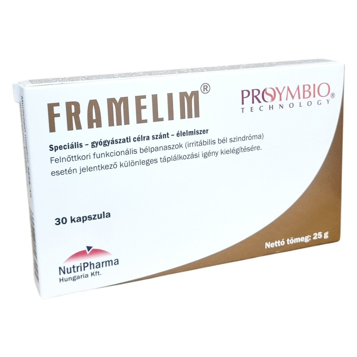 A Framelim® ProSymbio® speciális gyógyászati célra szánt élelmiszer, mely felnőttkori funkcionális bélpanaszok, például irritábilis bél szindróma esetén jelentkező táplálkozási igényekhez fejlesztett termék. A különleges formulában csukamájolaj található, amely gazdag omega-3 zsírsavakban, valamint A- és D-vitaminban. A készítmény baktérium lizátumokat tartalmaz Lactobacillus acidophilus és Bifidobacterium longum törzsekből, amelyek frakcionált hőkezeléssel készülnek. A kapszulák összetevői között szerepel továbbá több B-vitamin is, támogatva az anyagcsere folyamatokat. A termék nem használható önálló táplálékforrásként, és tejcukor-érzékenyek részére nem javasolt. Az adagolás napi három kapszula, legalább két hónapon át, az étkezés előtt vagy közben ajánlott. A tárolási feltételek között fontos a fénytől való védelem, a száraz környezet és a gyermekektől való elzárás. A készítményt orvosi ellenőrzés mellett szabad alkalmazni.