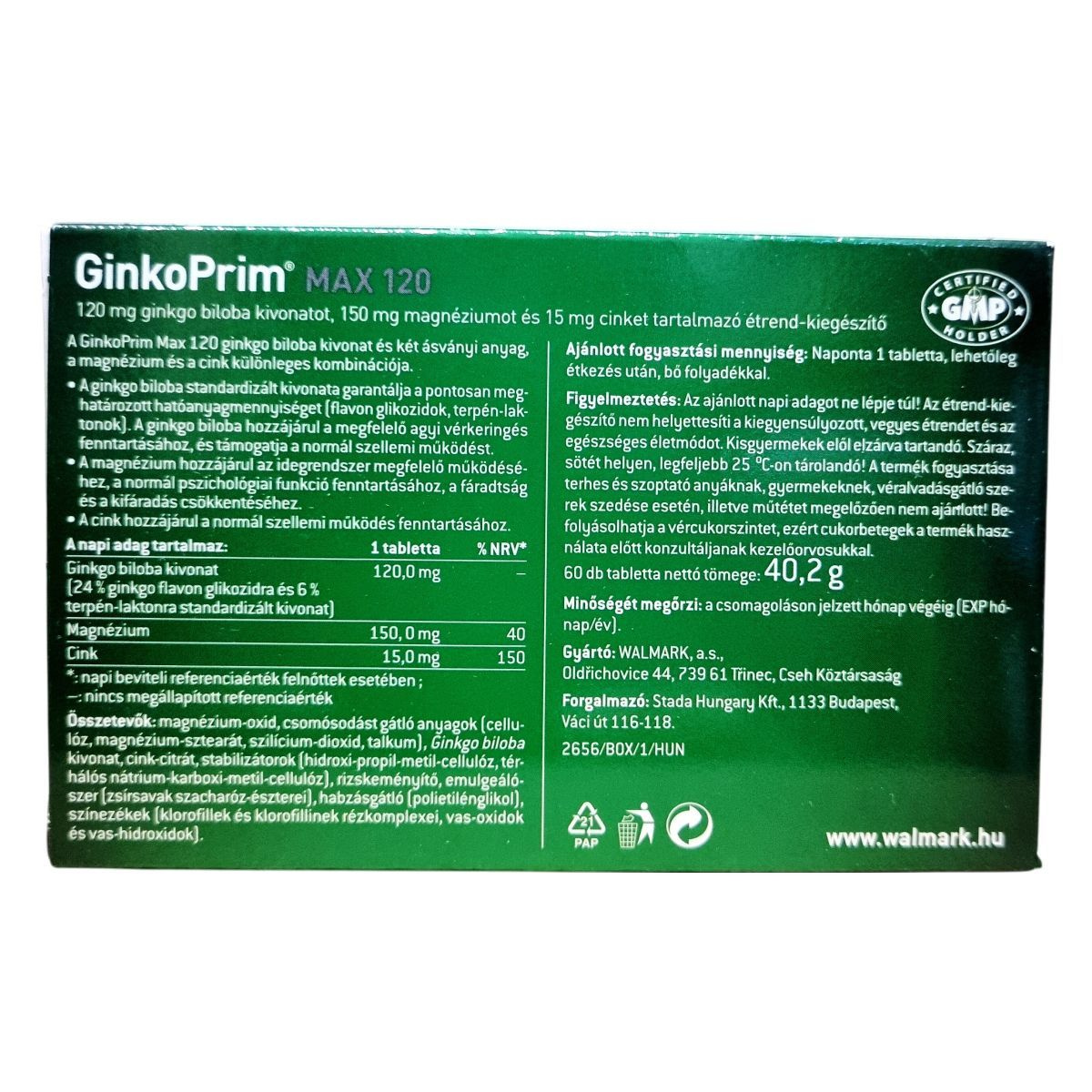 A GinkoPrim® MAX 120 mg ginkgo biloba kivonatot, 150 mg magnéziumot és 15 mg cinket tartalmaz, amelyek hozzájárulhatnak a szellemi frissesség fenntartásához és az idegrendszer megfelelő működéséhez.