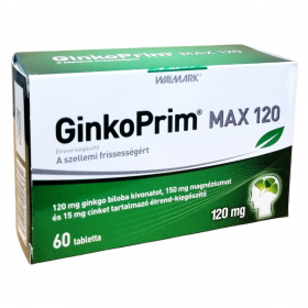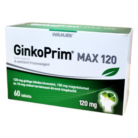 A GinkoPrim® MAX 120 egy étrend-kiegészítő, amely a szellemi frissesség támogatására készült. A termék 120 mg ginkgo biloba kivonatot tartalmaz, amely hozzájárulhat a megfelelő agyi vérkeringés fenntartásához és a normál szellemi működés támogatásához. A magnézium segíthet az idegrendszer megfelelő működésében, a normál pszichológiai funkció fenntartásában, valamint a fáradtság és kifáradás csökkentésében. A cink hozzájárulhat a normál szellemi működés fenntartásához. A termék 60 tablettát tartalmaz, és napi egy tabletta fogyasztása javasolt étkezés után, bő folyadékkal. Fontos, hogy az ajánlott napi adagot ne lépje túl, és a termék nem helyettesíti a kiegyensúlyozott étrendet és az egészséges életmódot.