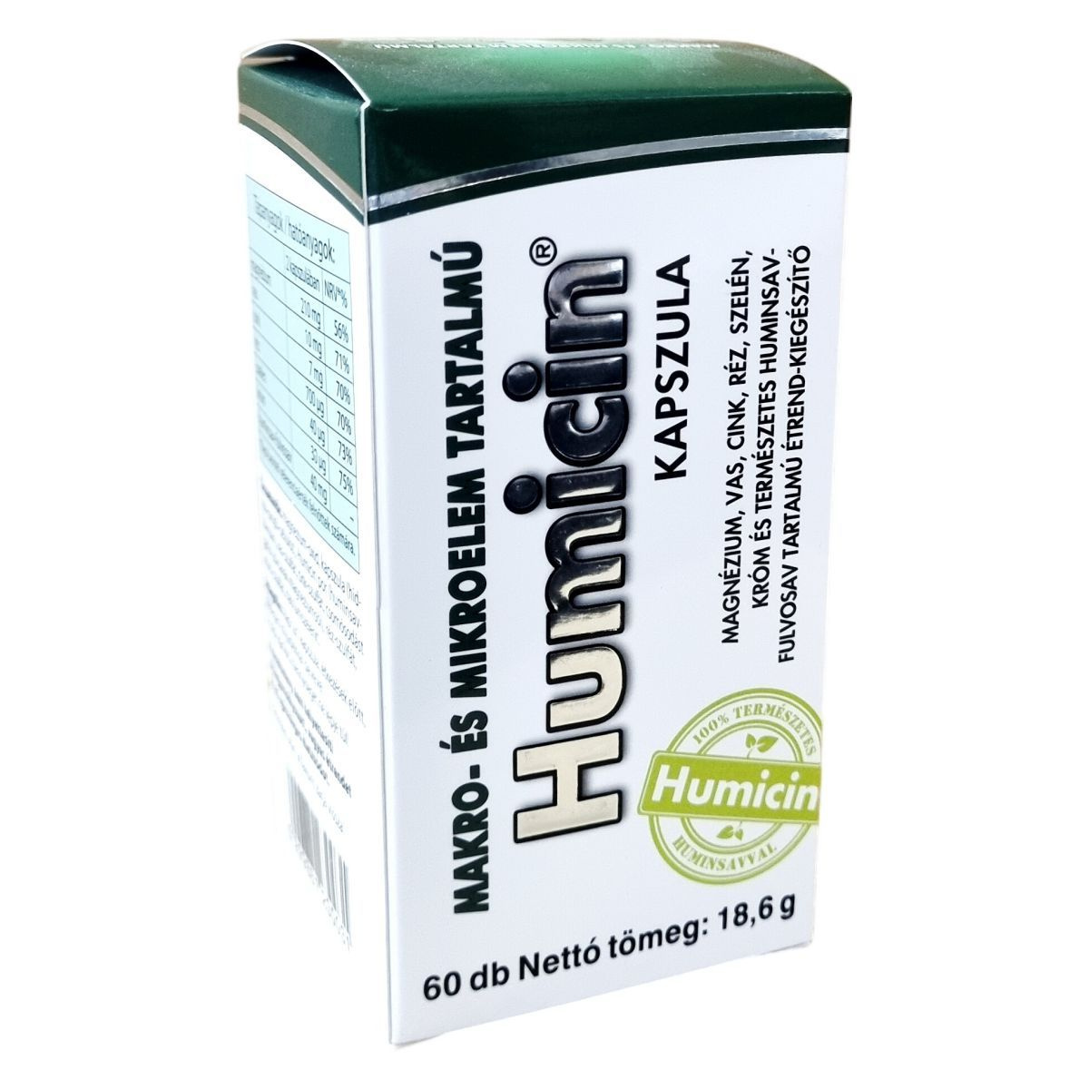 A Humicin® kapszula természetes huminsav-fulvosavat, valamint fontos makro- és mikroelemeket tartalmazó étrend-kiegészítő. Fogyasztása különösen ajánlott kiegyensúlyozatlan táplálkozás, szigorú diéta vagy vegetáriánus étrend esetén. A termék elősegítheti a szervezet megfelelő ásványianyag-ellátását, hozzájárulhat az egészséges életmód fenntartásához. Az adagolását és alkalmazását az ajánlások szerint szükséges betartani, és nem helyettesíti a változatos étrendet. A termék gyártója és forgalmazója a HUMIC 2000 Kft., a termék OGYÉI notifikációs számmal rendelkezik. Tárolását száraz, hűvös, fényvédett helyen kell végezni, gyermekek elől elzárva.