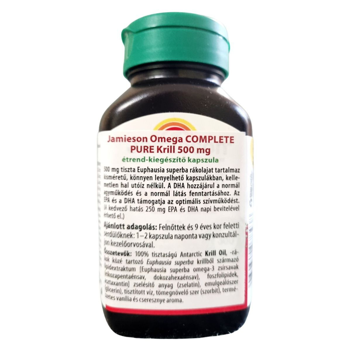 A Jamieson Omegacomplete Krill kapszula 500 mg tiszta Euphausia superba rákolajat tartalmaz, amely kisméretű, könnyen lenyelhető kapszulákban érhető el, kellemetlen hal utóíz nélkül. A termék célja, hogy támogassa a szív egészségét és a normál agyműködést, valamint a látás fenntartását. Az EPA és a DHA zsírsavak hozzájárulhatnak az optimális szívműködéshez, a kedvező hatás 250 mg EPA és DHA napi bevitelével érhető el. A termék minőségét a csomagoláson feltüntetett időpontig őrzi meg.