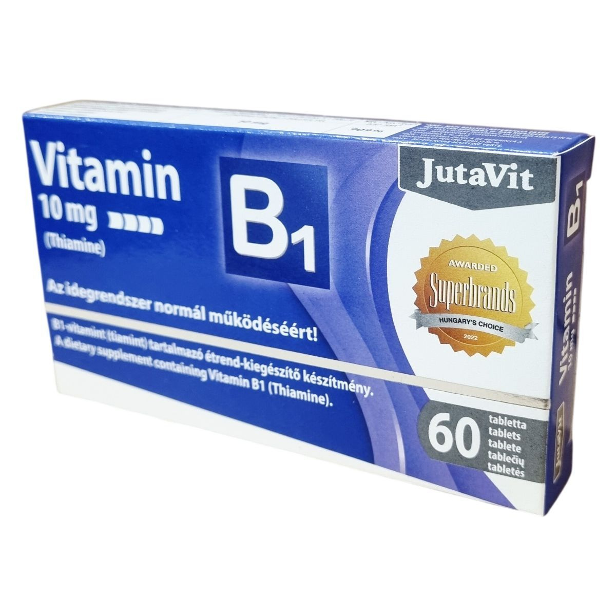 A JutaVit B1-vitamin 10 mg-os tabletta B1-vitamint (tiamint) tartalmazó étrend-kiegészítő készítmény, amely a normál energiatermelő anyagcsere-folyamatokban vehet részt. A B1-vitamin hozzájárulhat az idegrendszer normál működéséhez, a normál pszichológiai funkció fenntartásához és a szív megfelelő működéséhez. Vízhatlan vitamin, ezért naponkénti pótlása szükséges, akár a B-vitamin-komplex további összetevőivel együtt. A hosszú távú használat esetén C-vitamin hiány léphet fel, így javasolt a megfelelő arányban történő alkalmazásuk. A termék fehérjék, zsírok, szénhidrátok anyagcseréjében, valamint sejtszintű anyagcsere-folyamatokban is szerepet játszhat. A doboz 60 tablettát tartalmaz, nettó tömege 12 g.