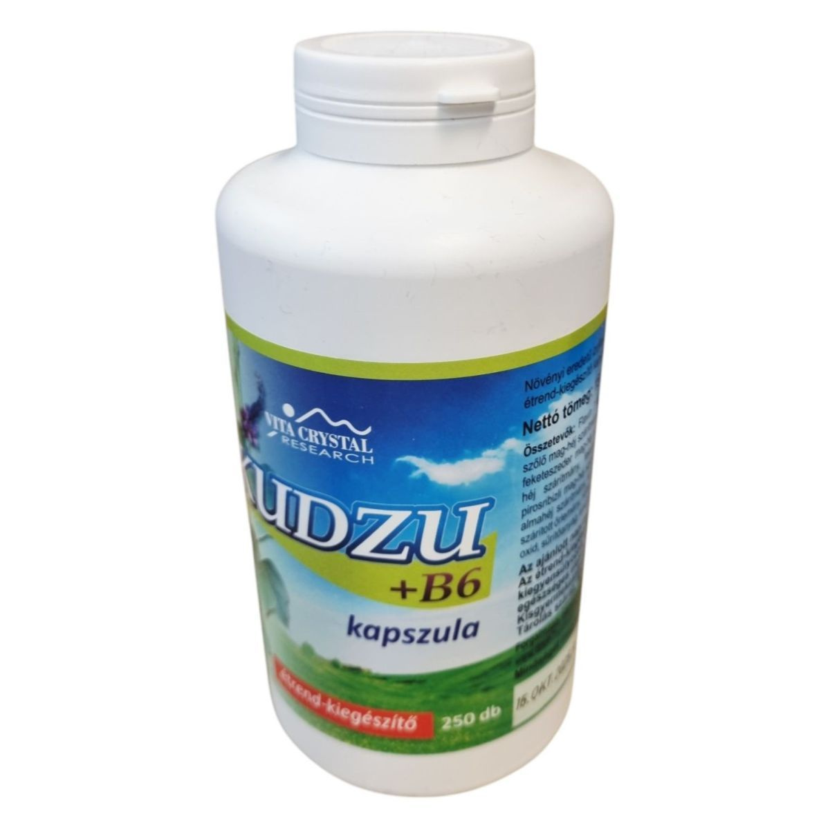 A VITA CRYSTAL RESEARCH KUDZU +B6 kapszula egy növényi eredetű izoflavonokat és polifenolokat tartalmazó étrend-kiegészítő, amely hozzájárulhat az egészséges életmód támogatásához. A termék B6 vitamint is tartalmaz, amely részt vehet az idegrendszer normál működésében. A kapszula Flavin 7 bioflavonoid komplexet és kudzu gyökér őrleményt tartalmaz, amelyek különböző növényi szárítmányokból állnak. Az étrend-kiegészítő fogyasztása nem ajánlott bizonyos csoportok számára, mint például terhes nők vagy hormon-függő daganatokkal diagnosztizált egyének. A termék tárolása száraz, hűvös helyen javasolt.