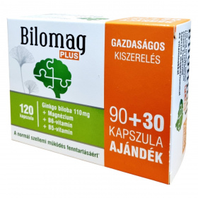 A Bilomag PLUS egy gazdaságos kiszerelésű étrend-kiegészítő, amely 110 mg Ginkgo biloba kivonatot, magnéziumot, B6- és B5-vitamint tartalmaz. A Ginkgo biloba hozzájárulhat a normál vérkeringéshez, beleértve az agyi vérkeringést, és támogathatja a normál szellemi működést, mint például a memória és a tanulás. A magnézium és a B6-vitamin segíthet az idegrendszer megfelelő működésében, míg a B5-vitamin hozzájárulhat a normál mentális teljesítményhez. A termék 90+30 kapszulát tartalmaz, amely ajándékként is szolgálhat. Fontos, hogy a termék alkalmazása előtt konzultáljon orvosával, különösen, ha gyógyszereket szed.