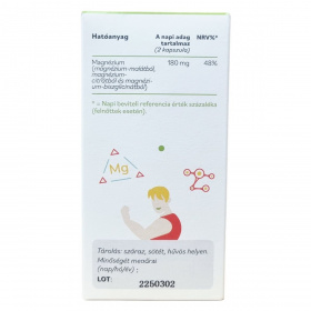 A magnézium hozzájárul az idegrendszer megfelelő működéséhez, a normál izomműködéshez, a fáradtság és a kifáradás csökkentéséhez, a normál pszichológiai funkció és az elektrolit egyensúly fenntartásához, részt vesz a normál csontozat és fogazat fenntartásában. A termék teljesen elreagáltatott formákat tartalmaz: a magnézium-citrát esetén a magnézium 100%-a citromsavhoz, a magnézium-malát esetén maláthoz, a magnézium-biszglicinát esetén glicinhez kötődik. Nettó tömeg: 83 gramm. Kiszerelés: 90 darab kapszula.