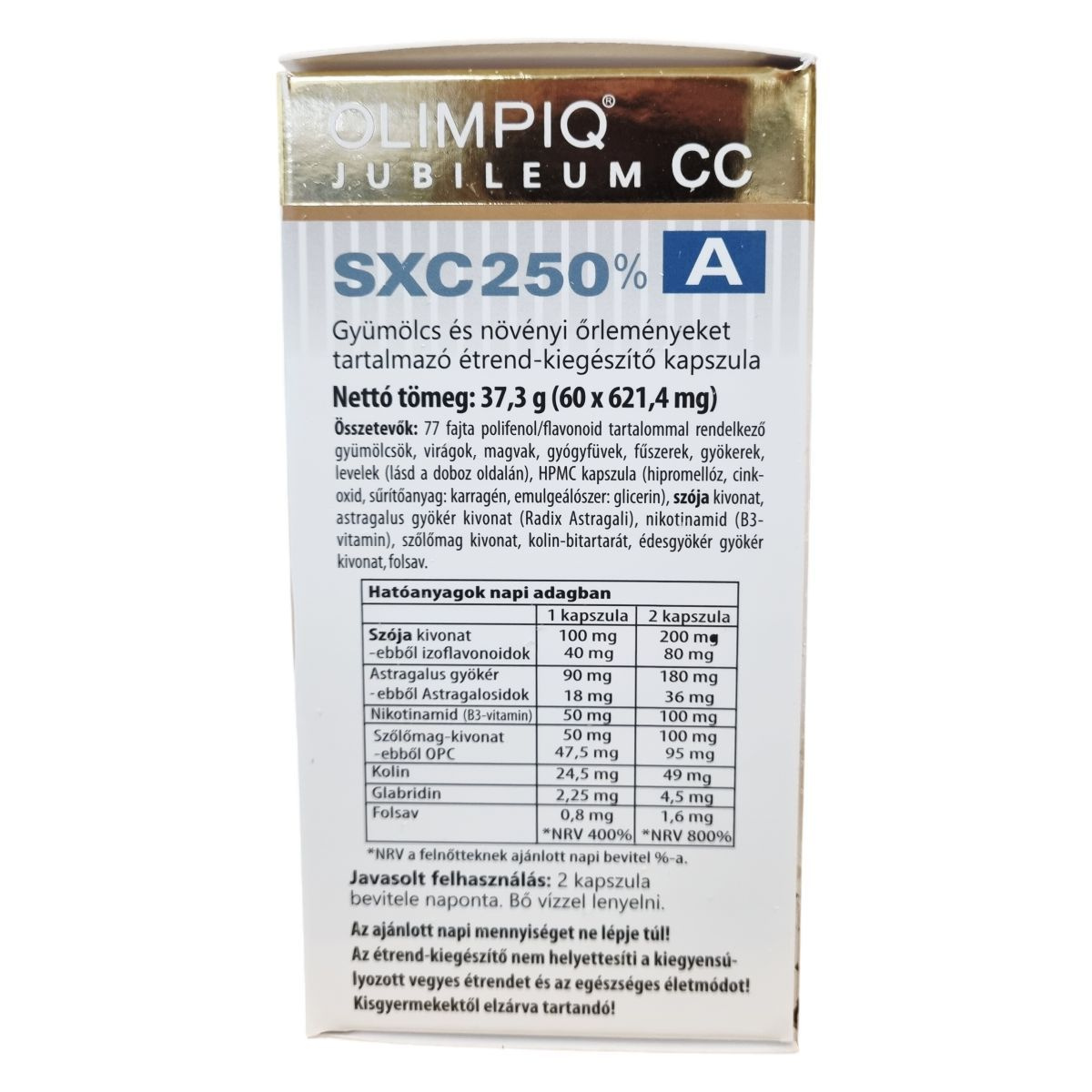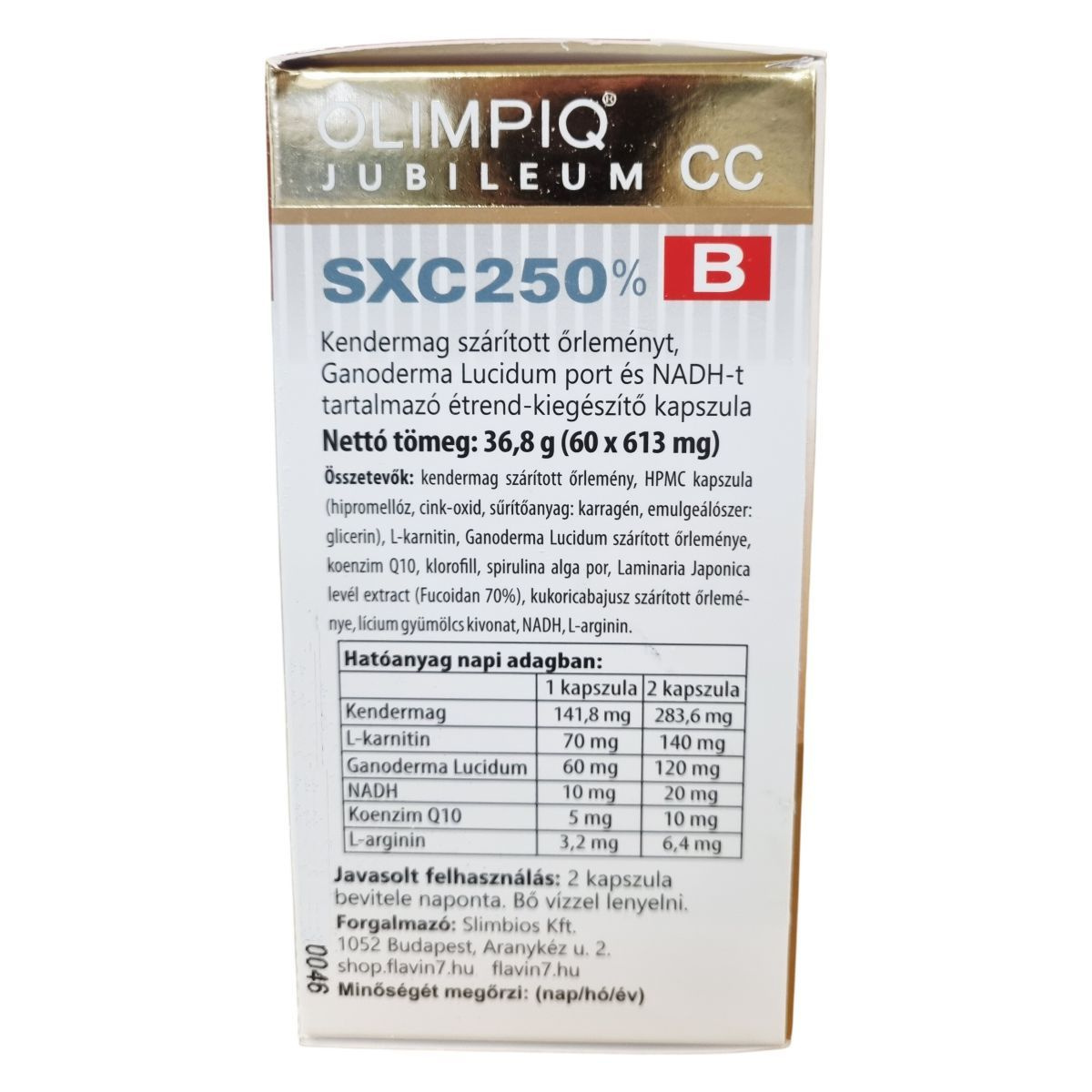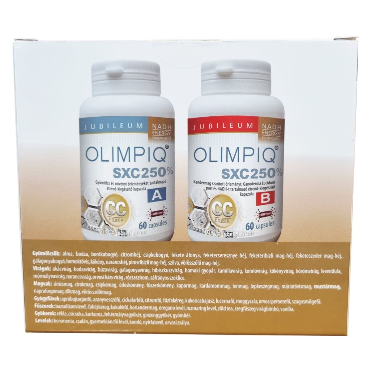 Az Olimpiq SXC250% CC Power két kapszulából álló komplex étrend-kiegészítő rendszer. Az A kapszula főként polifenol- és flavonoid-tartalmú gyümölcs-, növényi- és gyógynövény-őrleményeket, valamint szója kivonatot, szőlőmag-kivonatot és B3-vitamint tartalmaz. A B kapszula kendermaggal, Ganoderma Lucidummal, NADH-val, koenzim Q10-zel és aminosavakkal támogatja a szervezet működését. A termék DR kapszulákban kerül forgalomba. Nettó tömeg: A – 37,3 g, B – 36,8 g (2 x 60 kapszula).