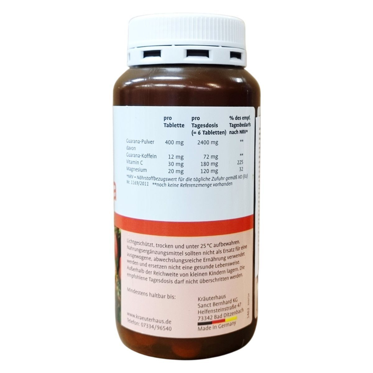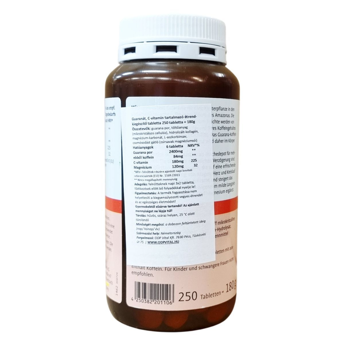 A guarana por, C-vitamin és magnézium együttesen egy koffeintartalmú étrend-kiegészítő tablettát alkot, amely hozzájárulhat a mindennapi vitalitás fenntartásához. A készítmény legalább 250 tablettát tartalmaz, amelyeket napi rendszerességgel, a főétkezések előtt, bő folyadékkal javasolt bevenni. A termék kizárólag kiegyensúlyozott és változatos étrend kiegészítésére szolgál, nem helyettesíti az egészséges életmódot. A csomagolás és a tabletták összetevői között megtalálható a mikrokristályos cellulóz, hidrolizált kollagén, magnézium-karbonát és L-aszkorbinsav, továbbá csomósodást gátló anyagként zsírsavak magnéziumsói szolgálnak. A termék származási helye Németország, ahol a gyártás is történik.