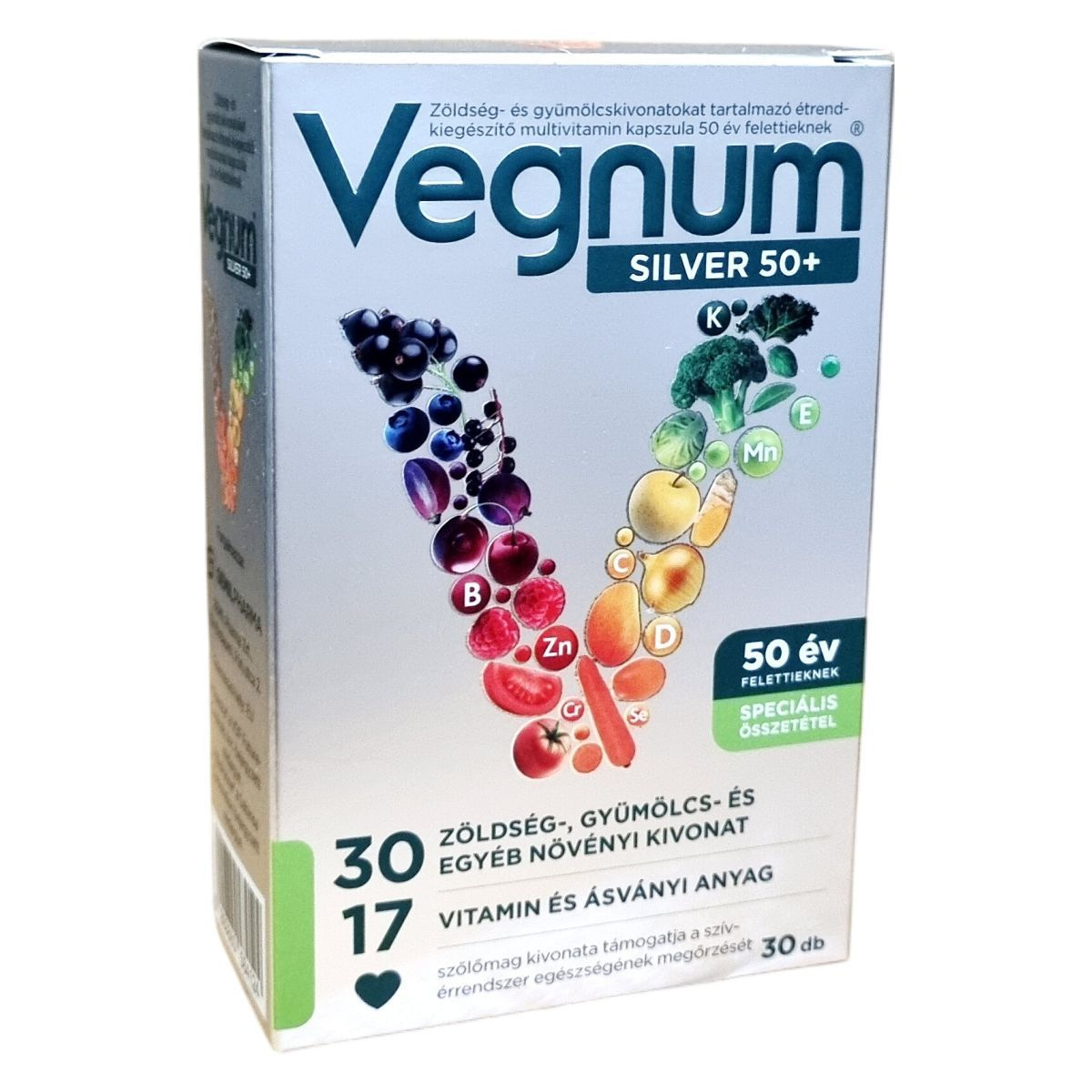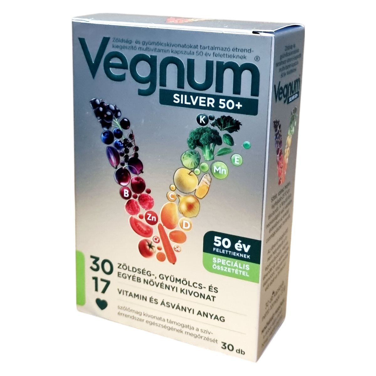A Vegnum SILVER 50+ multivitamin kapszula 50 év felettiek számára készült, és 30 féle zöldség-, gyümölcs- és egyéb növényi kivonatot, valamint 17 vitamint és ásványi anyagot tartalmazhat. Szőlőmag kivonata hozzájárulhat a szív- és érrendszer egészségének megőrzéséhez.