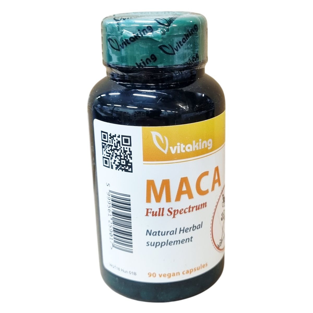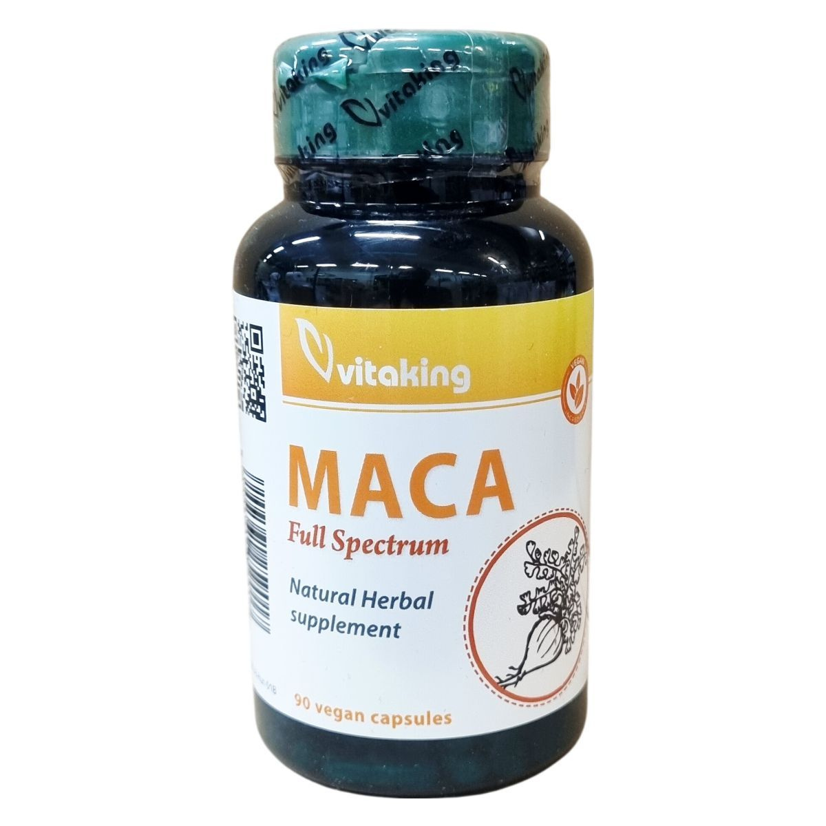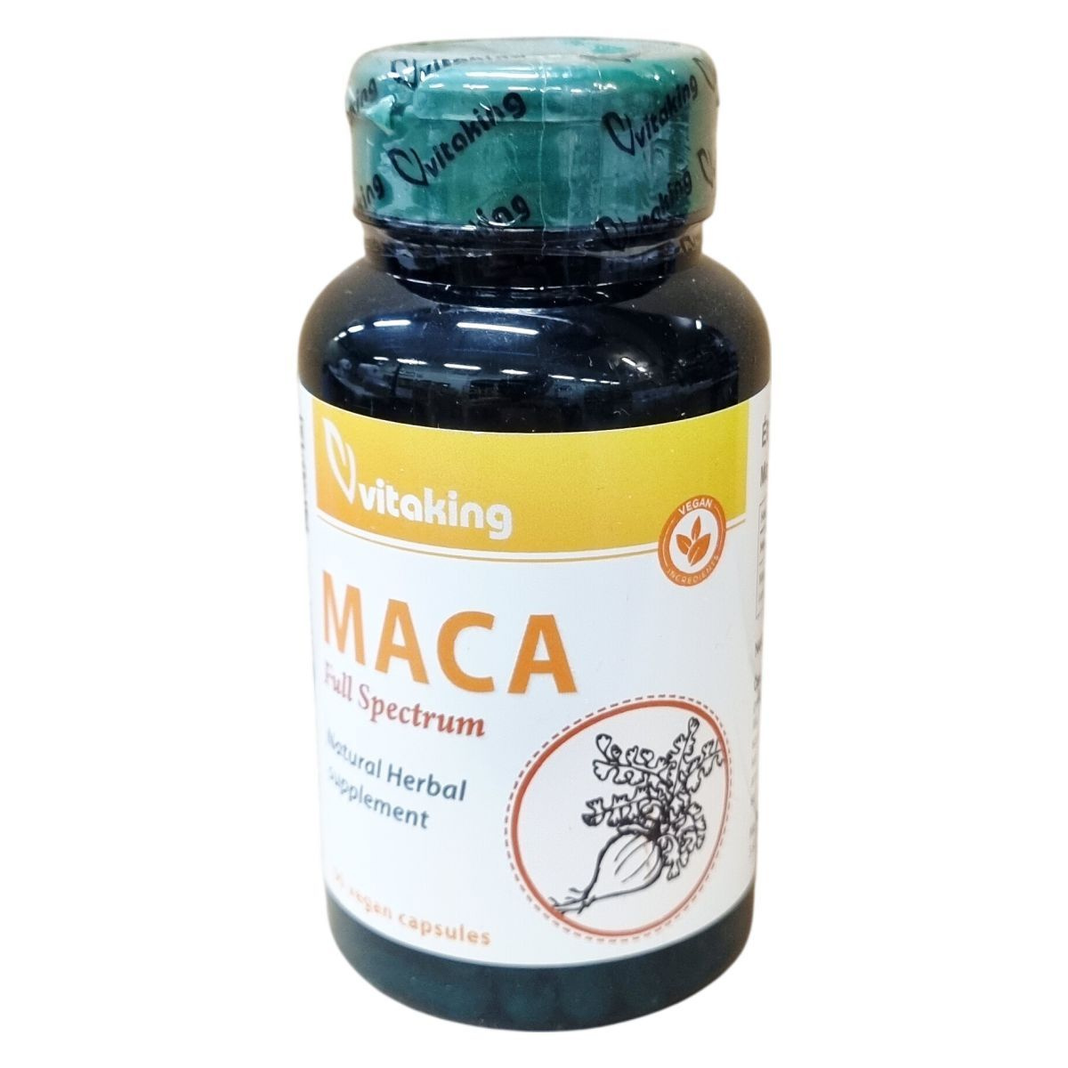 A Vitaking Maca Full Spectrum készítmény Maca gyökér 10:1 kivonatot és porított Maca gyökeret tartalmaz. A termék nettó tömege 28,8 g, 90 darab kapszulát tartalmaz. A kapszula vegán, és többféle adalékanyagot is tartalmaz a minőség és a stabilitás biztosítására, mint például maltodextrint, vízmentes dikalcium-foszfátot, hidroxi-propil-metil-cellulóz kapszulát, csomósodásgátló anyagokat (zsírsavak magnézium sói, szilícium-dioxid). A termék szigorú előírások szerint, megbízható gyártási körülmények között készül, a GMP minősítés tanúsítja a magas minőségi normákat. A termék napi ajánlott adagolása három kapszula, melyet étkezés közben javasolt bevenni. A csomagolást gyermekek elől ajánlott elzárni, illetve száraz, hűvös, fénytől és hőtől védett helyen tárolni. A termék nem helyettesíti a vegyes étrendet, és az egészséges életmódot.